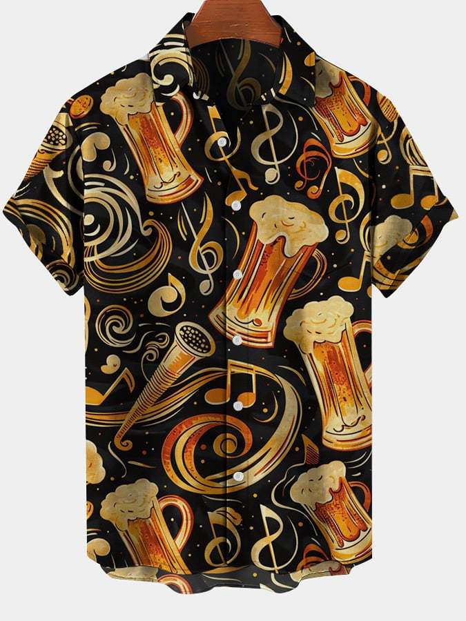 Men's Fashion Music Beer Note Print Short Sleeve Shirt