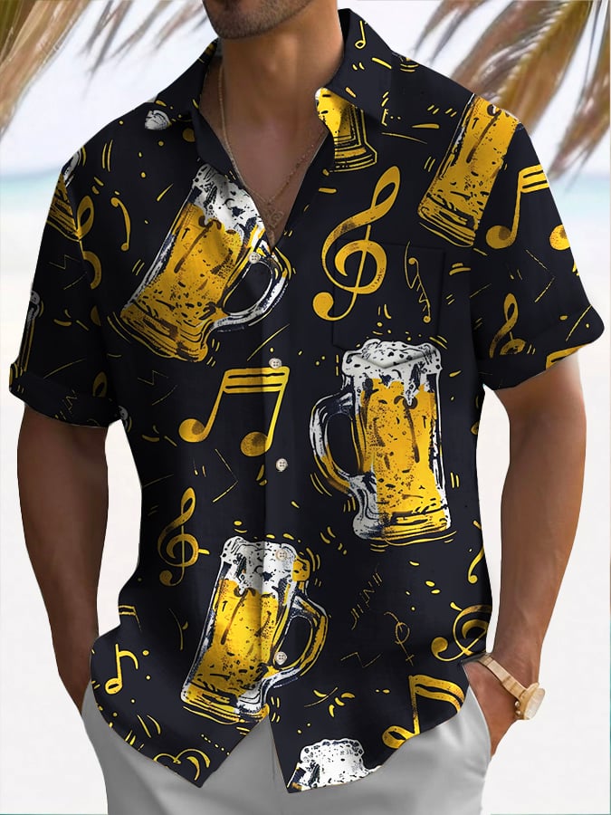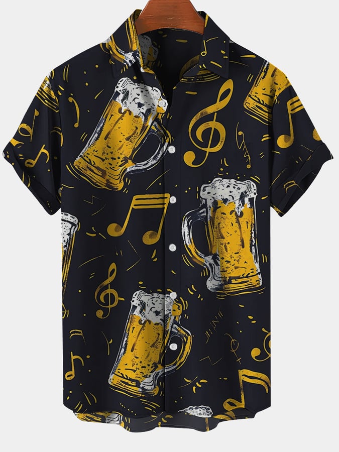 Men's Fashion Music Beer Note Print Short Sleeve Shirt