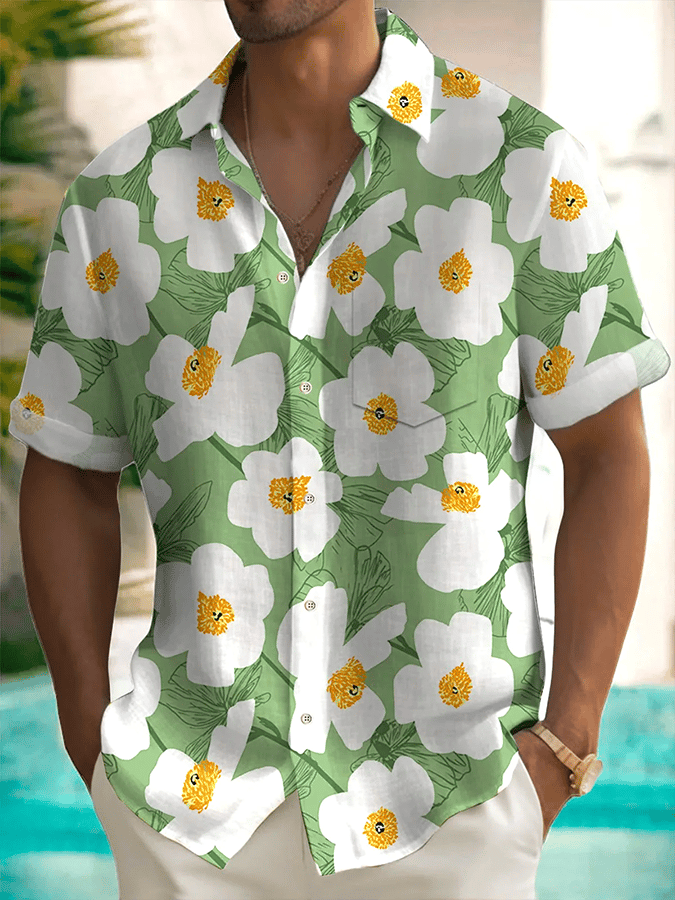 Men's Hawaiian Floral Print Short Sleeve Pockets Shirt