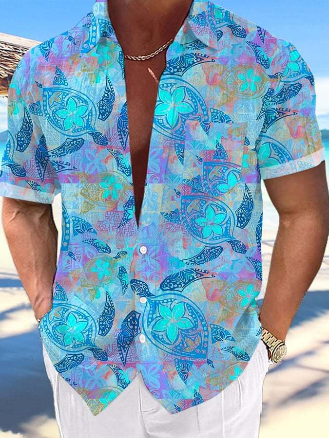 Men's Hawaiian Island Turtle Print Short Sleeve Pockets Shirt