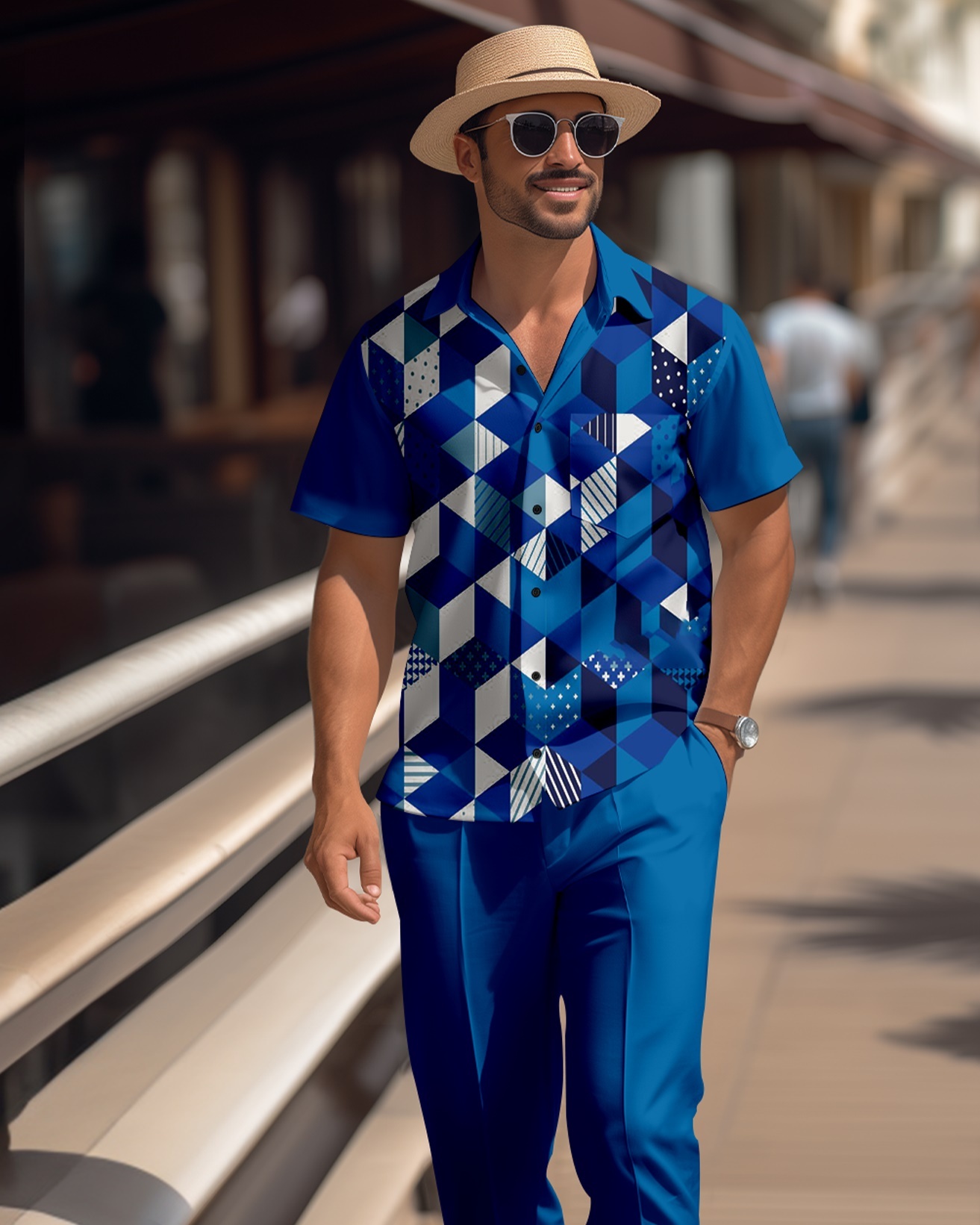 Men's retro colorblock short-sleeved shirt walking Suit 1672
