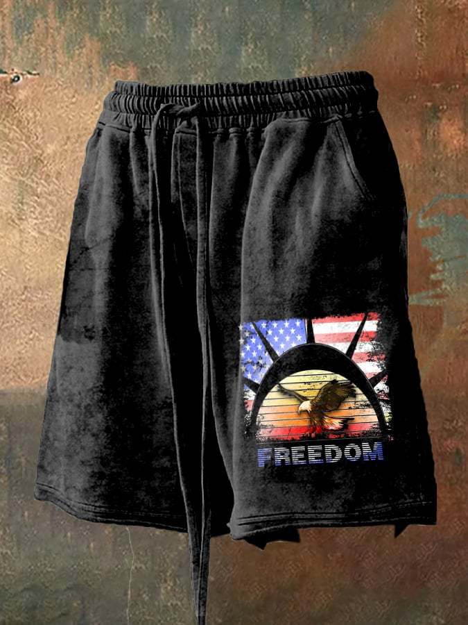 Men's Retro Distressed Hem Independence Day Print Loose Shorts