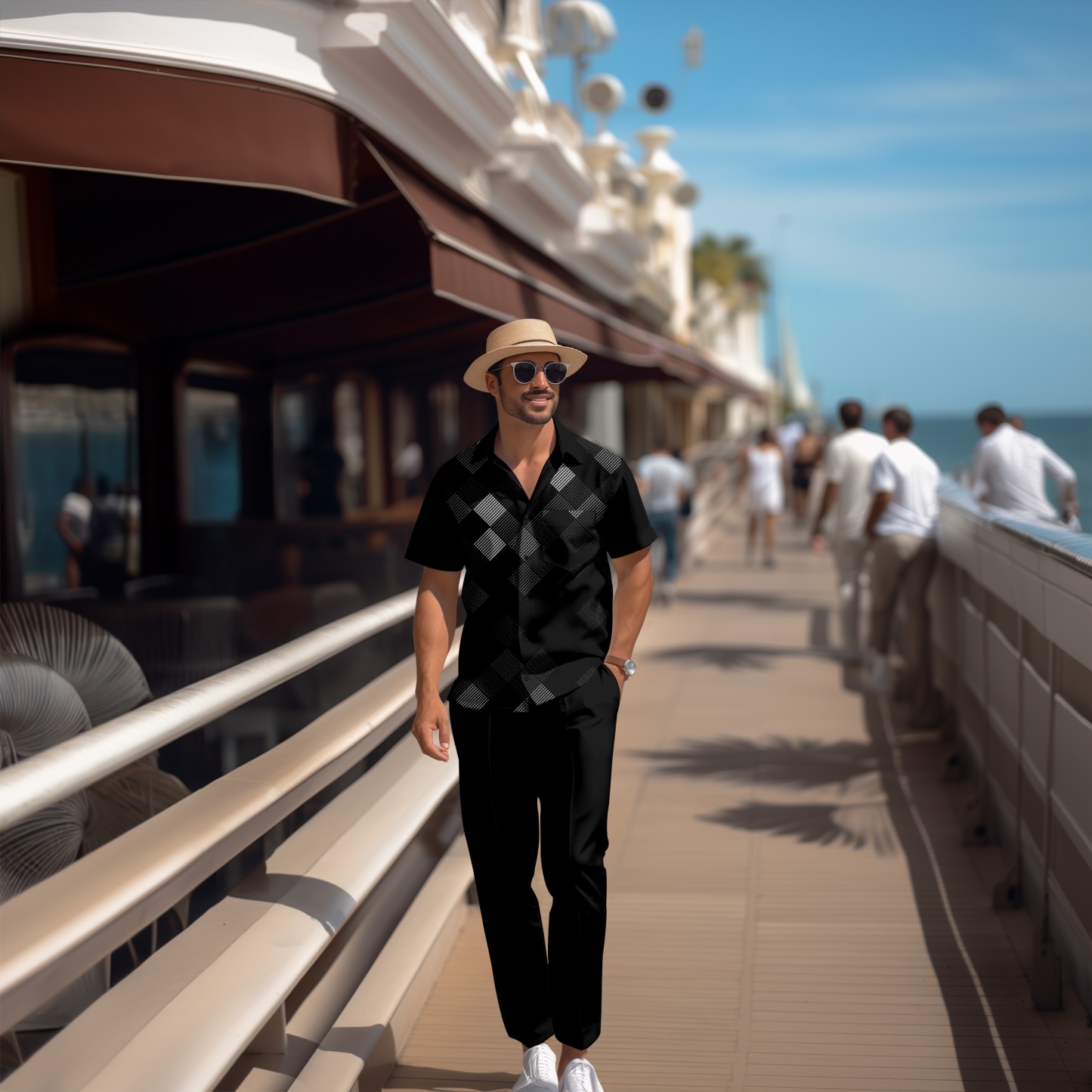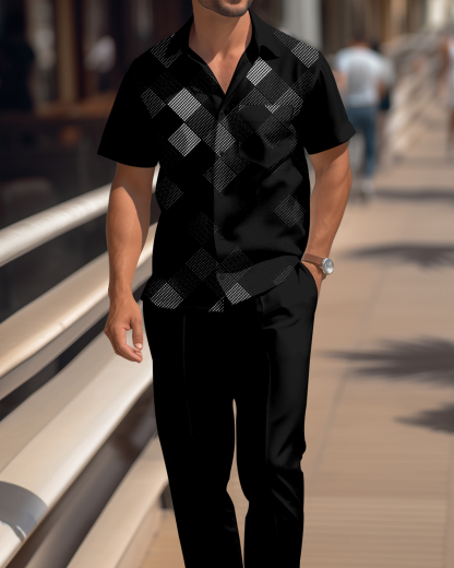 Men's Retro Plaid Colorblock Short Sleeve Shirt Walking Suit 1673