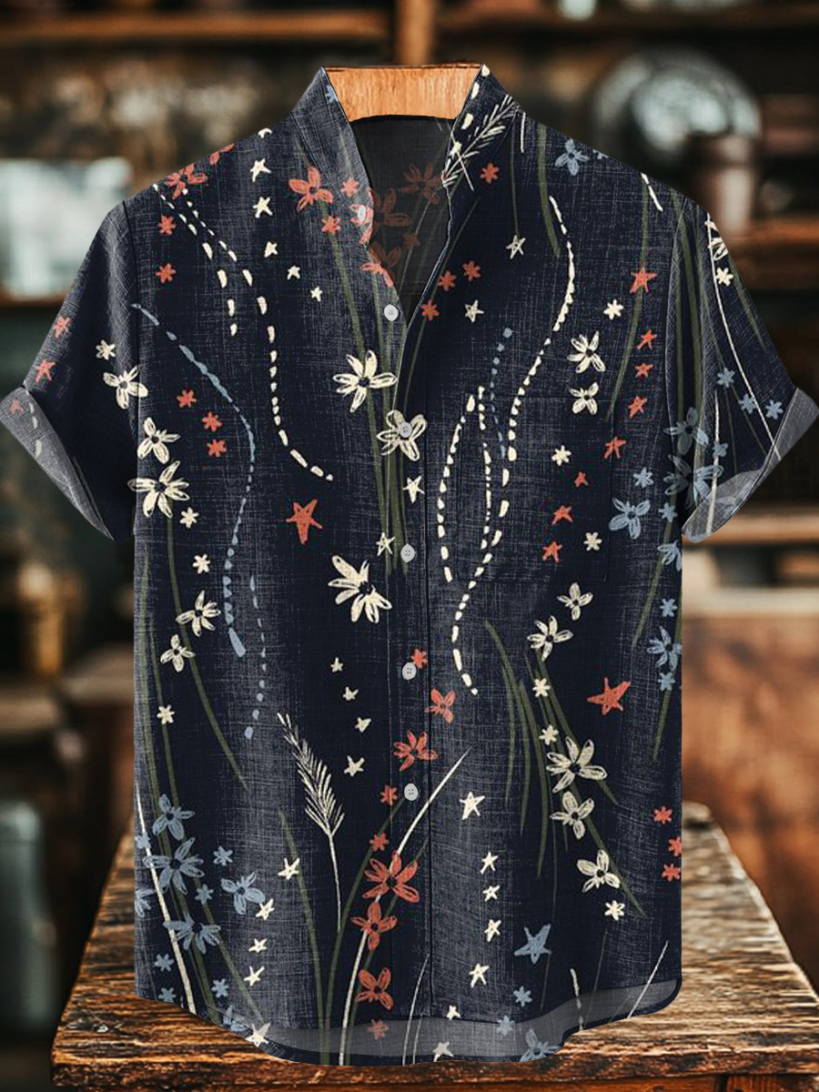 Men's Retro Simple Flowers Print Casual Short Sleeve 100% Cotton Shirt