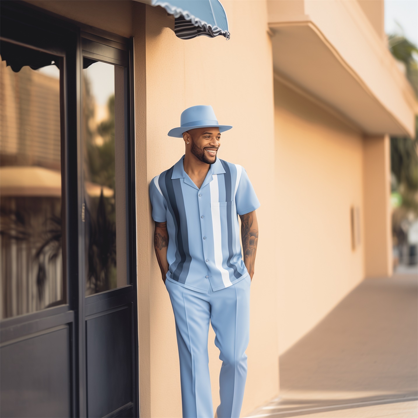Men's Retro Vertical Striped Short Sleeve Shirt Walking Suit