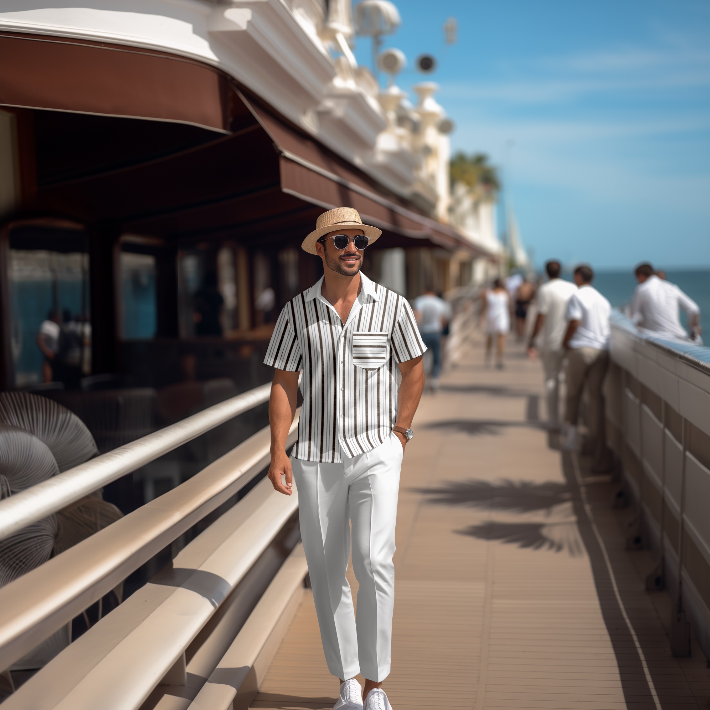 Men's White Striped Colorblock Short Sleeve Shirt Walking Suit 1669