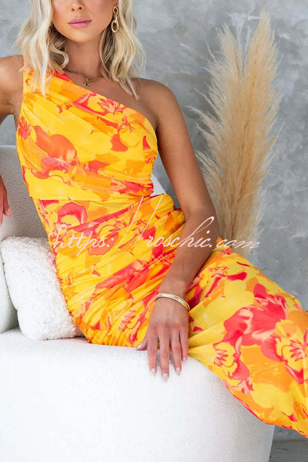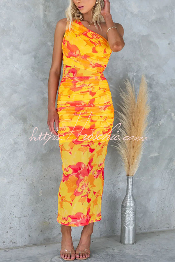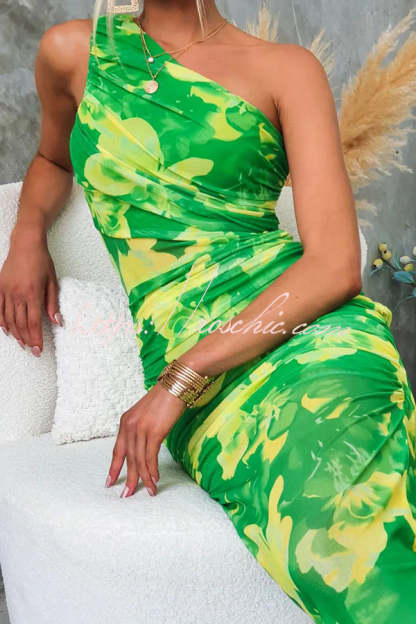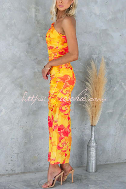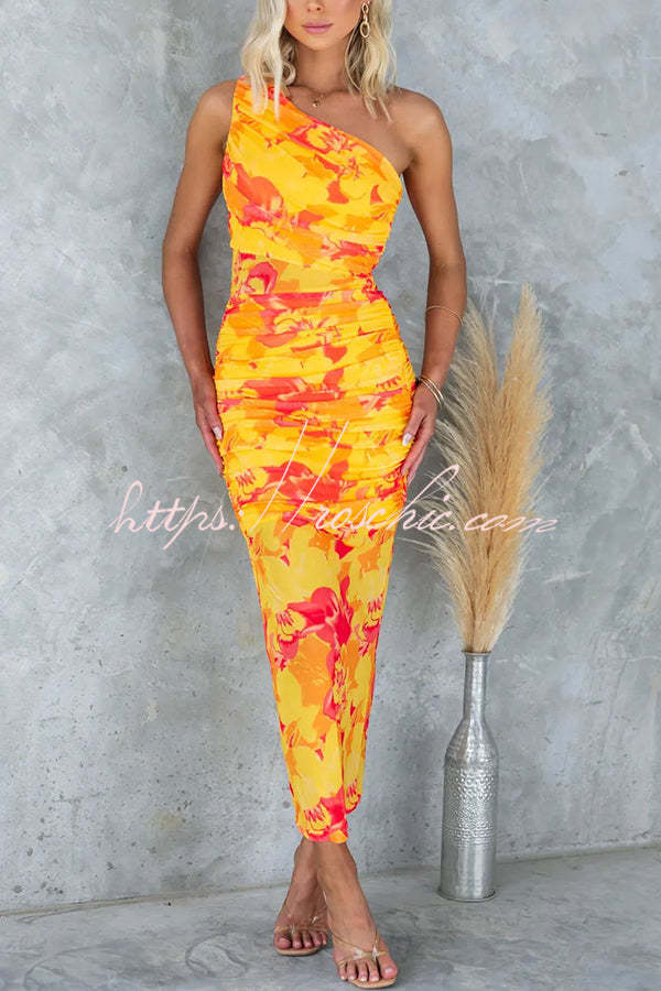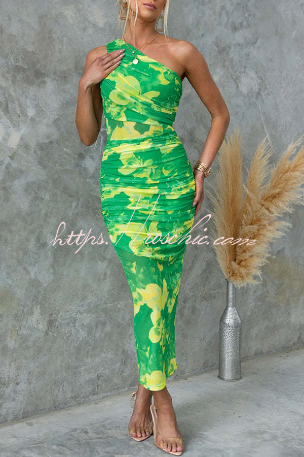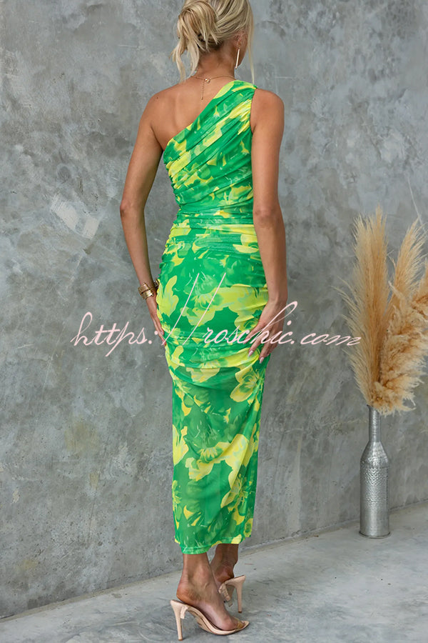 Night Blooms Mesh Overlay Printed One Shoulder Ruched Stretch Maxi Dress