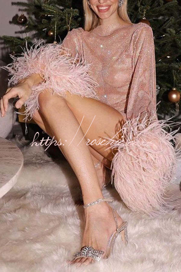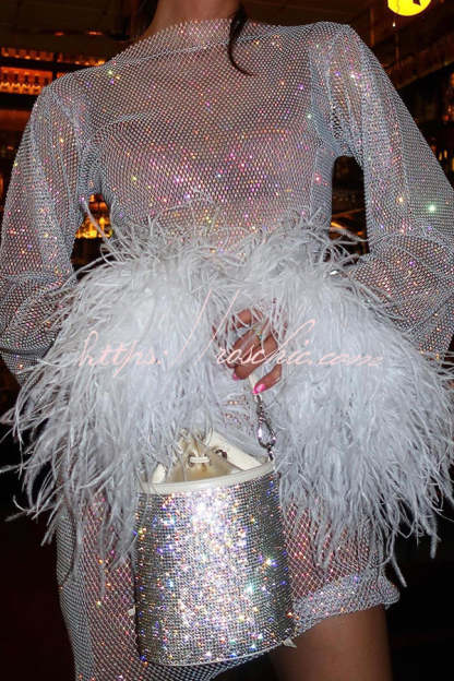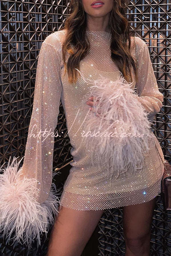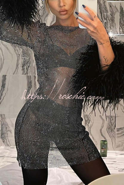 Night Surprise Rhinestone Fabric Feather Sleeve Party Mini Dress