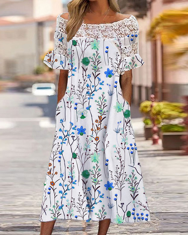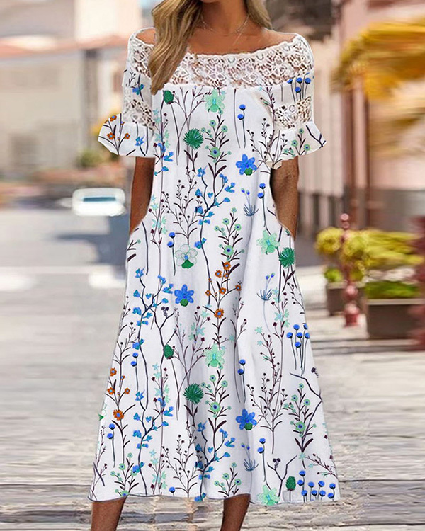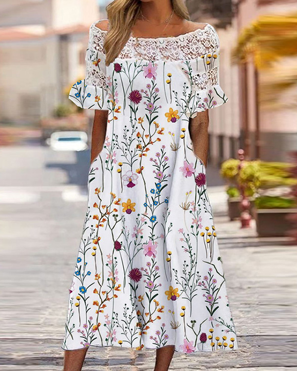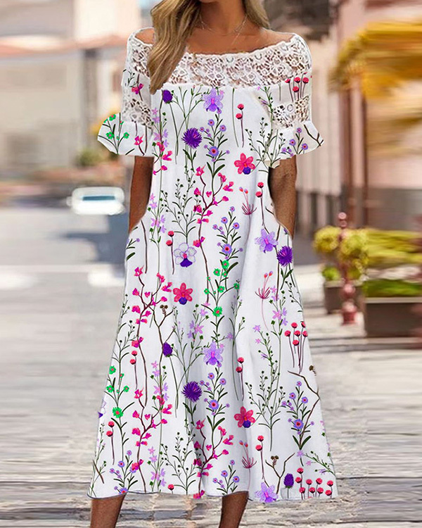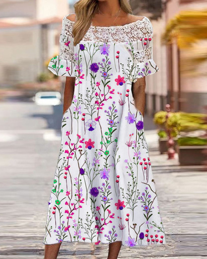 Off Shoulder Lace Sleeve Short Sleeve Floral Dress
