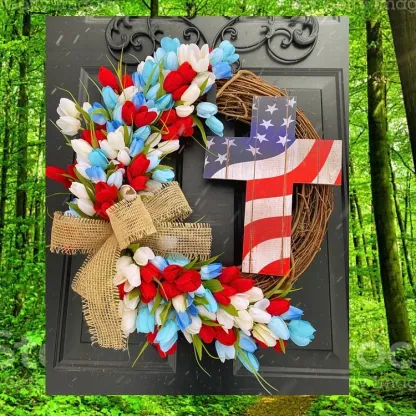 Patriotic wreath, made with red, white, & blue tulips, a burlap bow, & finished with cross. Perfect for year round, 4th of July, and would make a great gift!