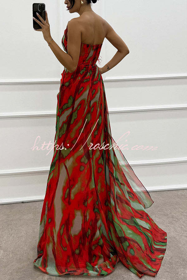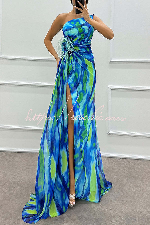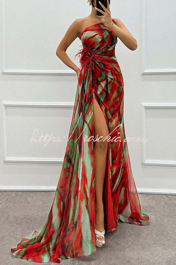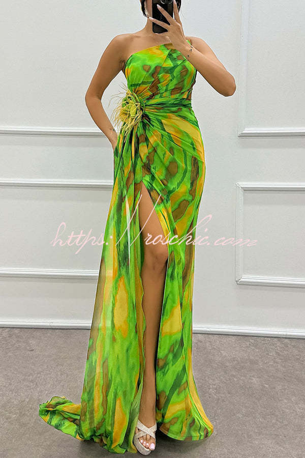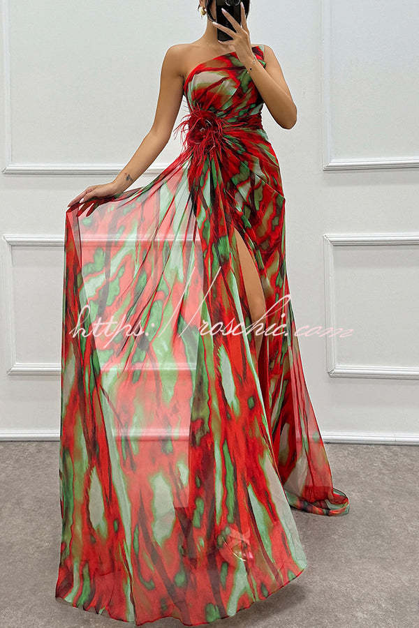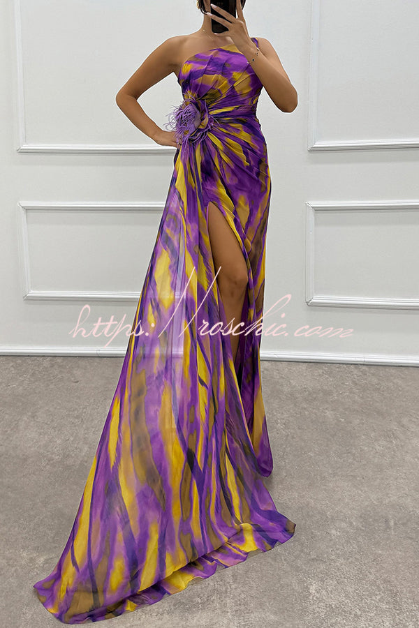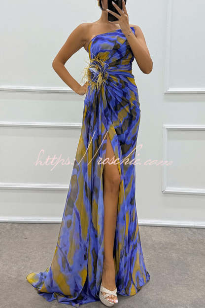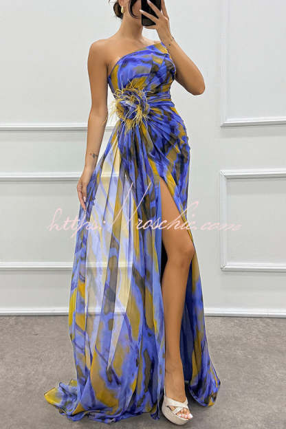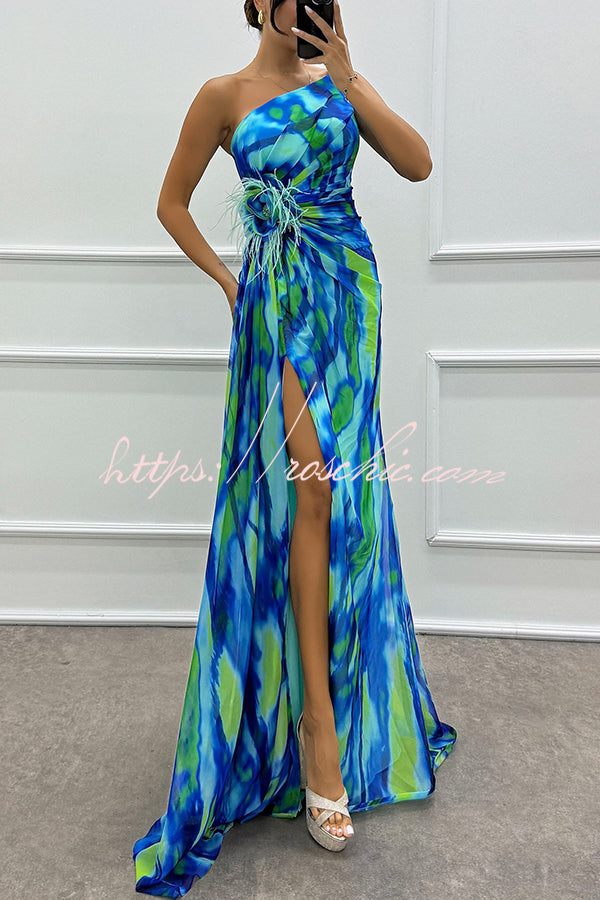 Amazing Views Watercolor Print Feather Rose Detail Off Shoulder Pleated Slit Maxi Dress