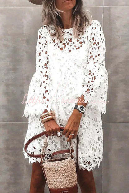 Pretty Presence Floral Crochet Lace Bell Sleeve Mini Dress