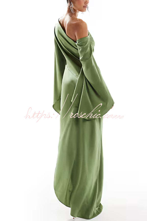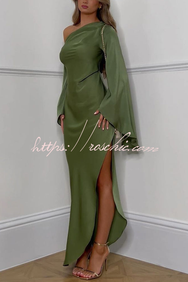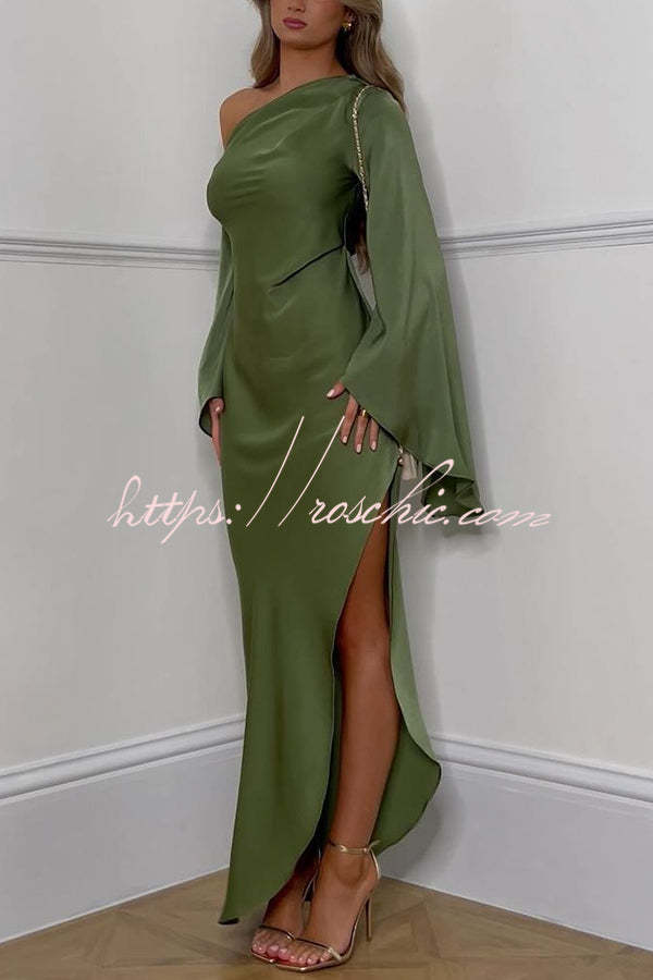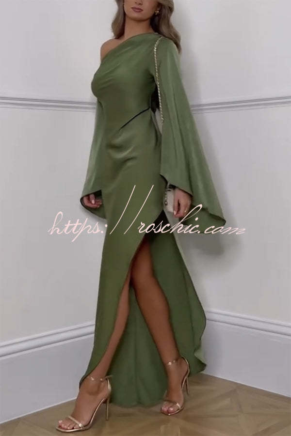 Zayla Satin Asymmetrical One Shoulder Bell Sleeve Slit Maxi Dress
