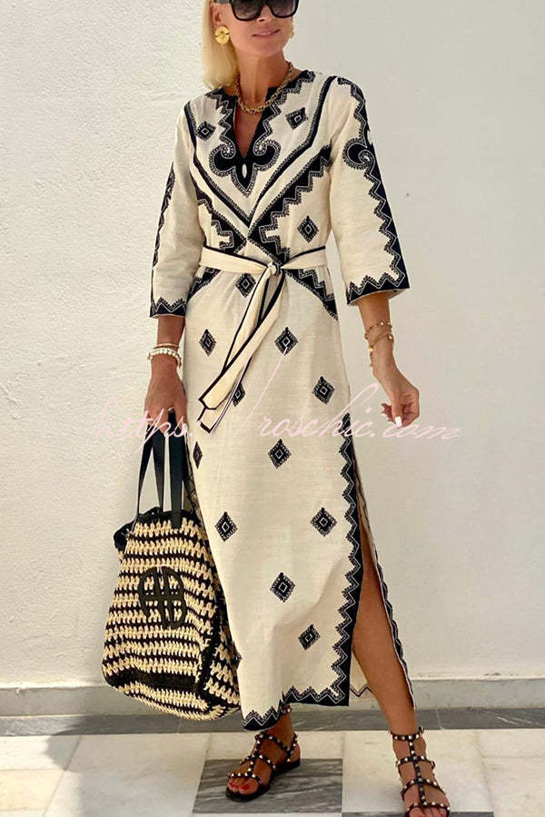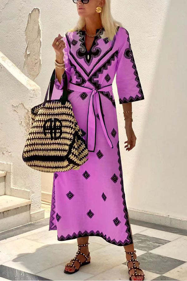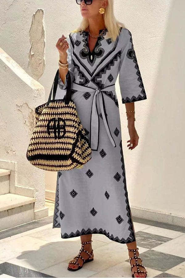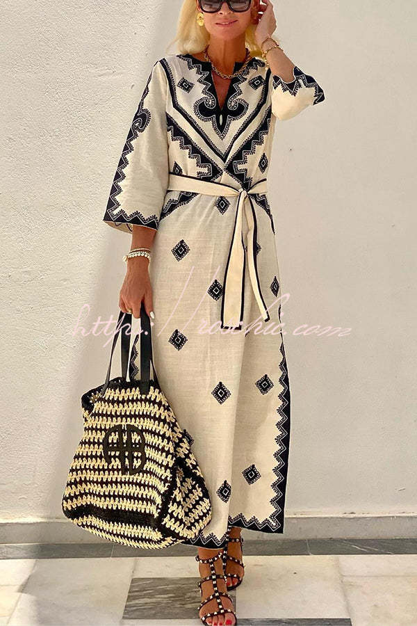 Quiet Atmosphere Linen Blend Ethnic Print Belted Midi Dress