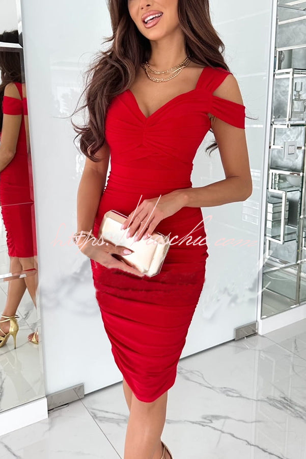 Raise A Toast Cold Shoulder Ruched Pencil Midi Dress