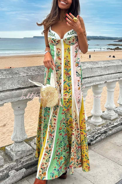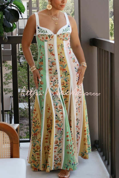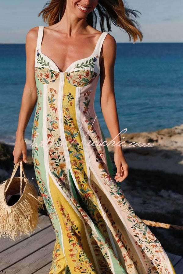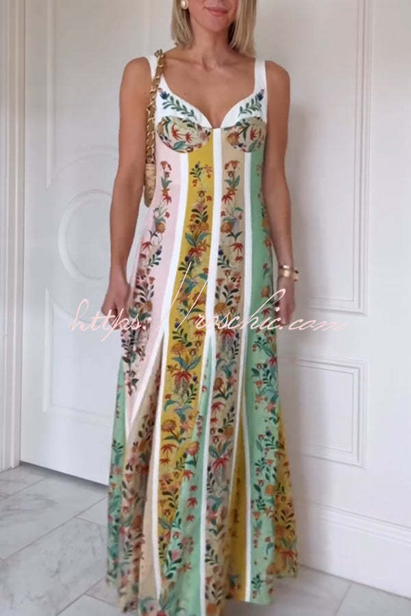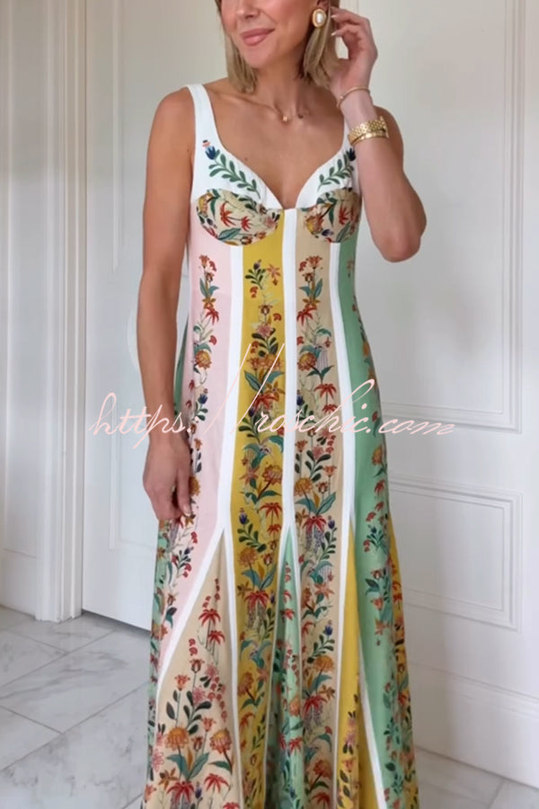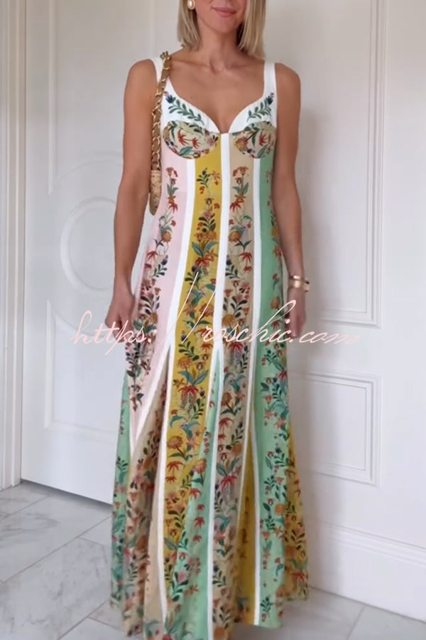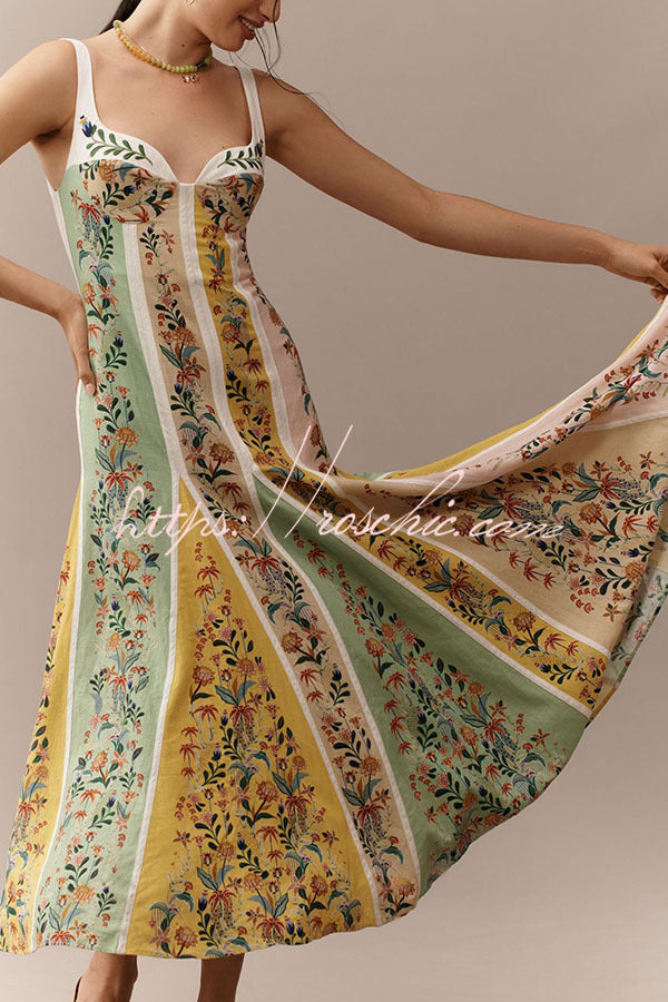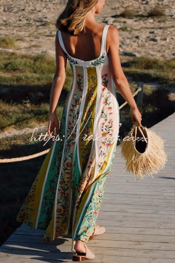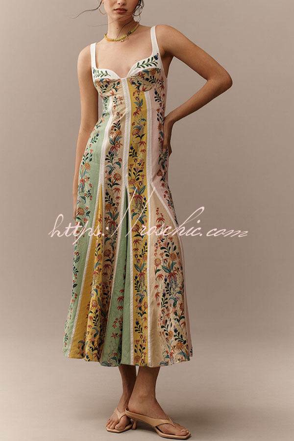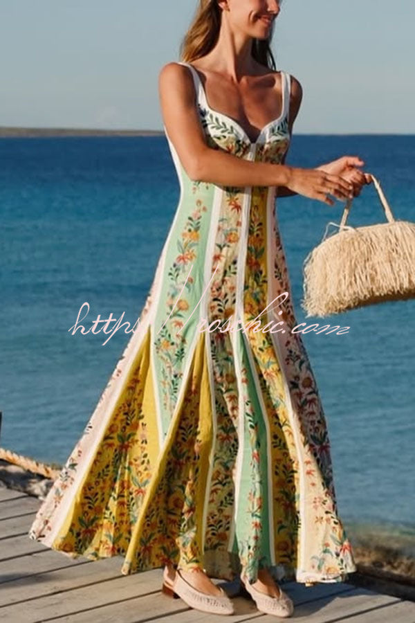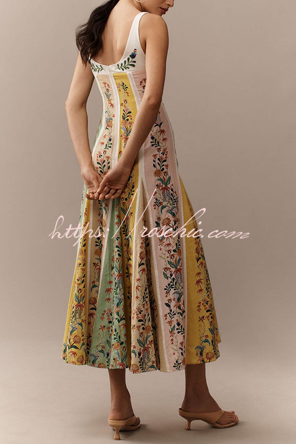 Sweet Garden Linen Blend Color Block Floral Paneled Maxi Dress