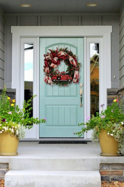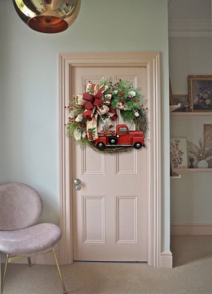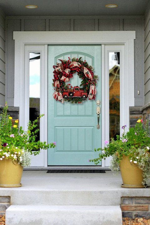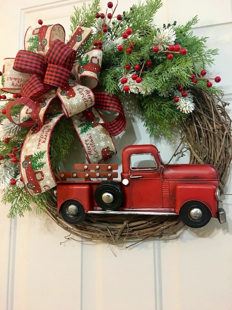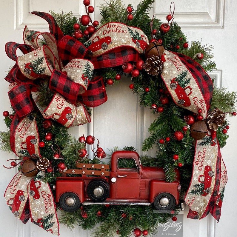 Vintage Red Truck Christmas Wreath made with junifer and flocked pine with green and red berries with 13″ metal red truck finished with black and red check and red truck bow. This is a perfect farmhouse wreath on your front door for christmas or hang it anywhere inside your house.