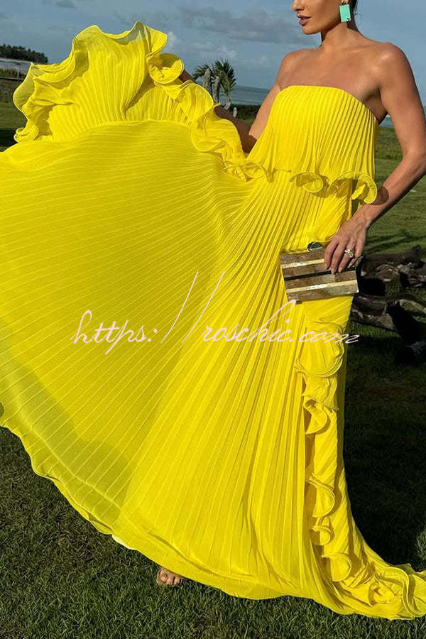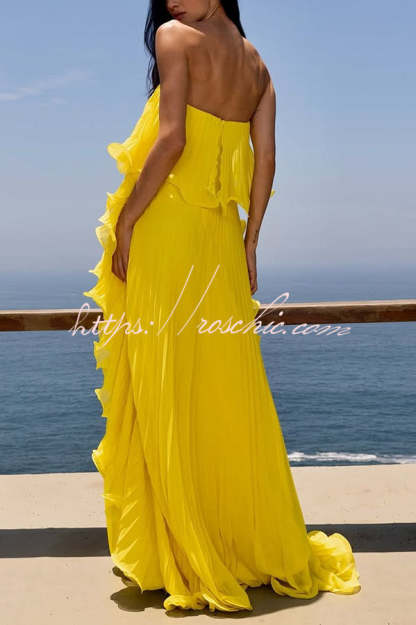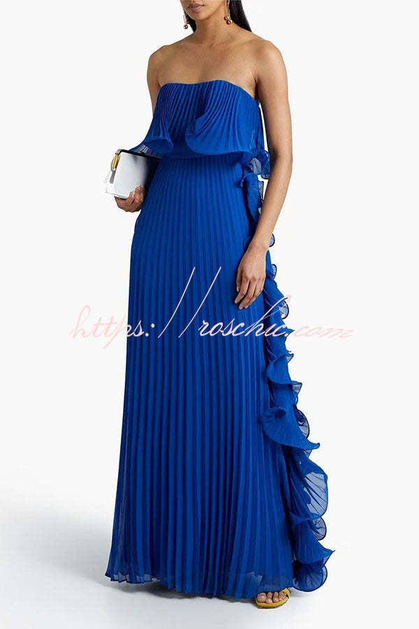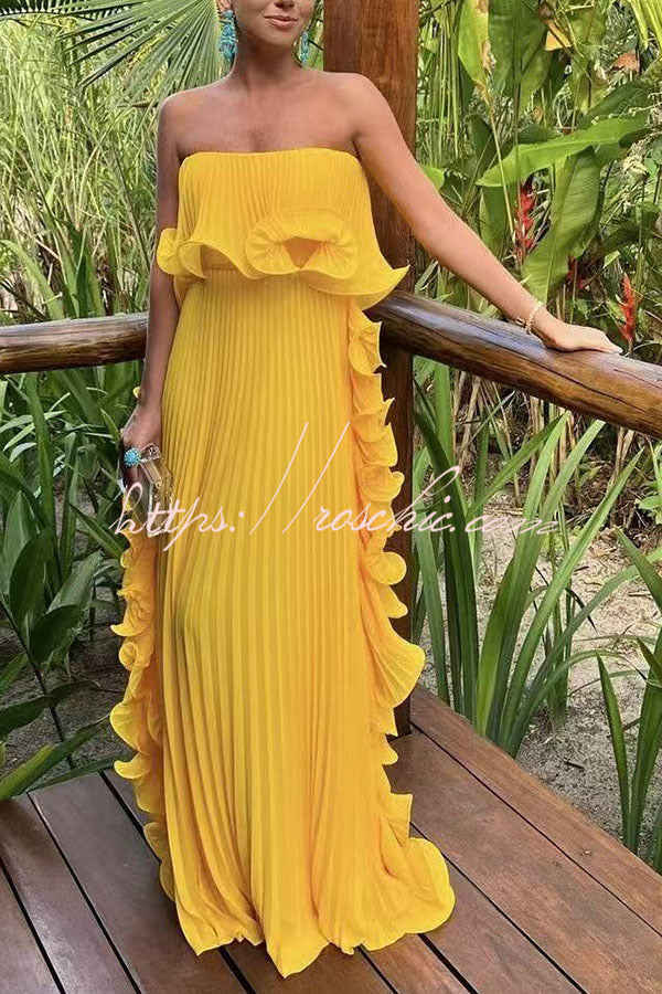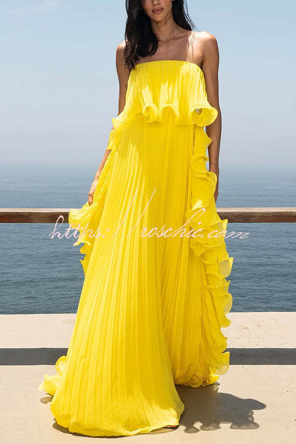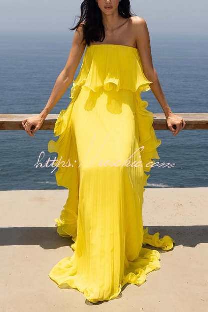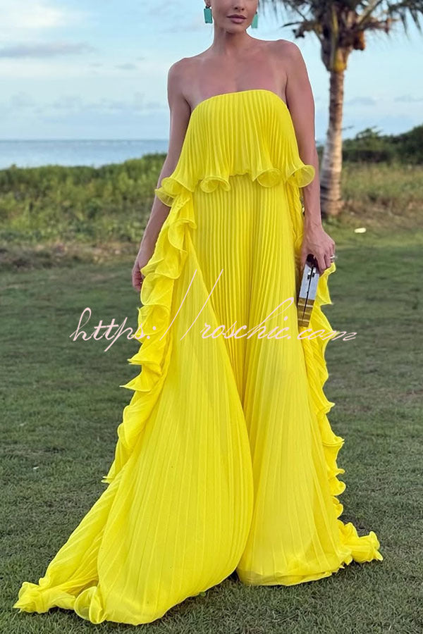 Reina Chiffon Pleated Wavy Ruffles Trim Strapless Loose Maxi Dress