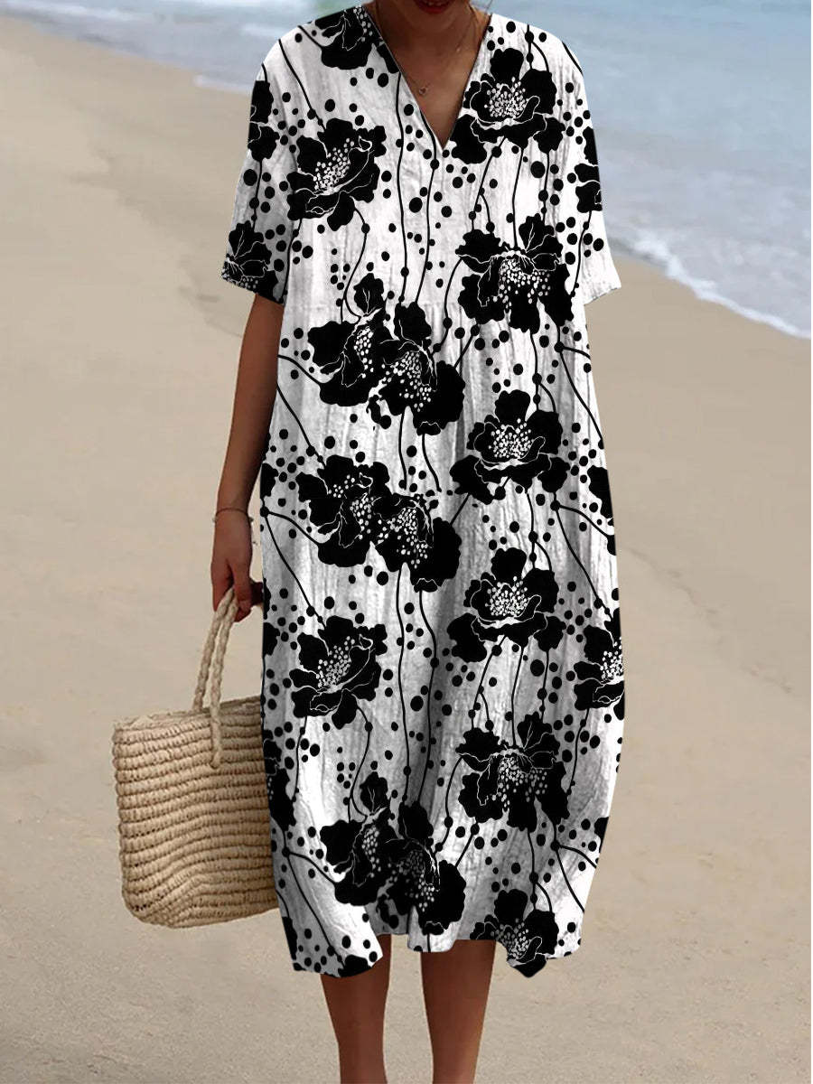 Retro Boho Floral Art Printed V-Neck Elegant Chic Loose Short Sleeve Midi Dress