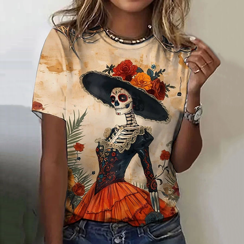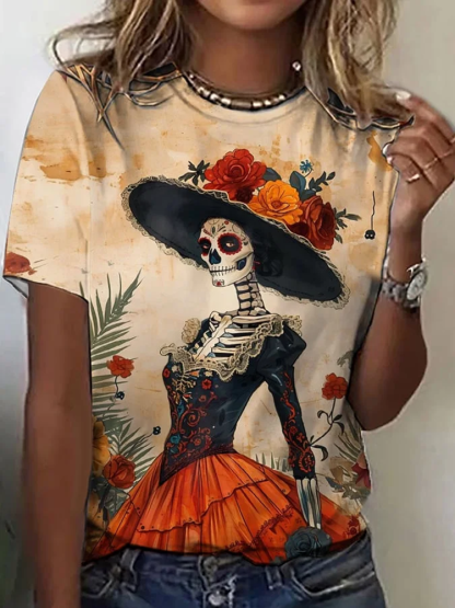 Retro Day Of The Dead Mexican La Catrina Art Pattern Print Cotton Graphic T-Shirt