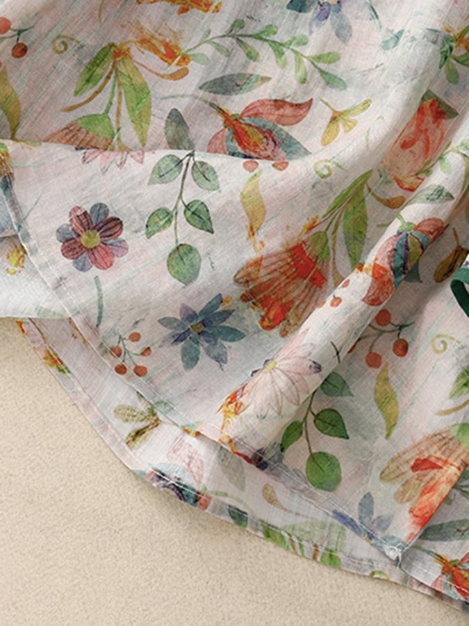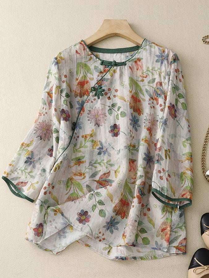 Retro Vintage Ethnic Style Thin Print Frog Button 4/3 Sleeve Shirt