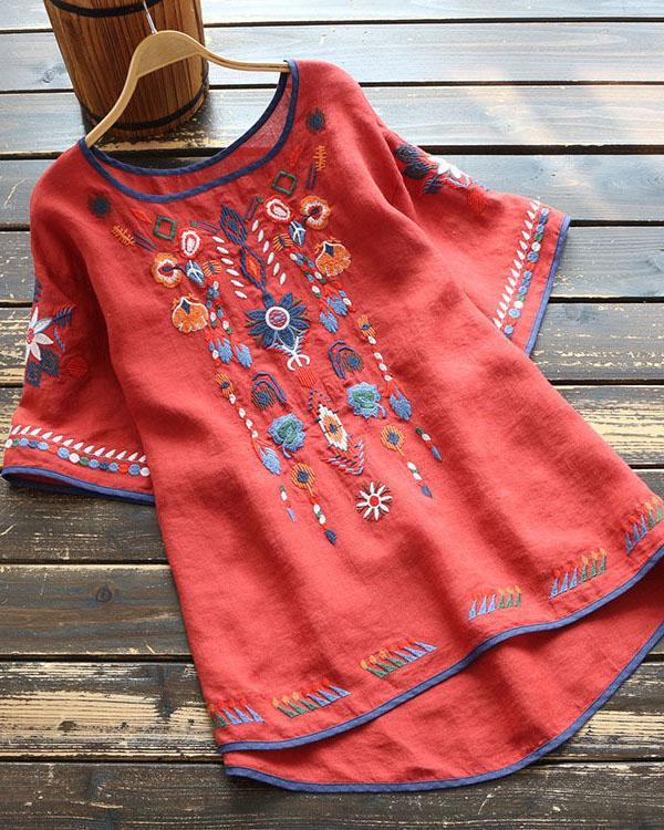 Round Neck Linen Embroidered Top