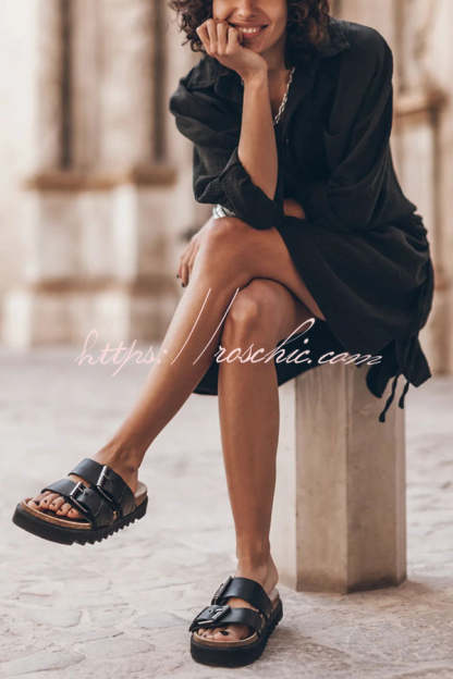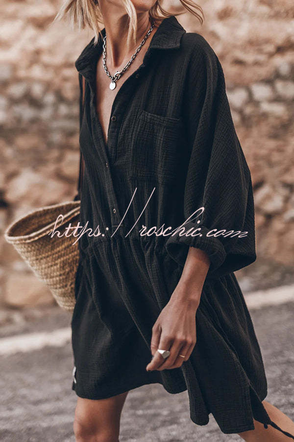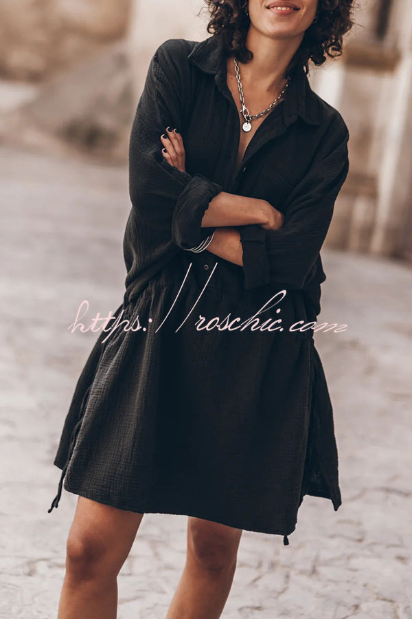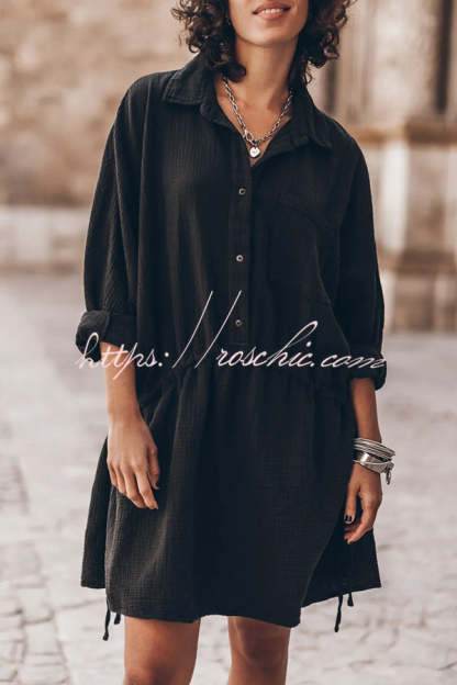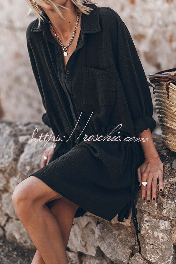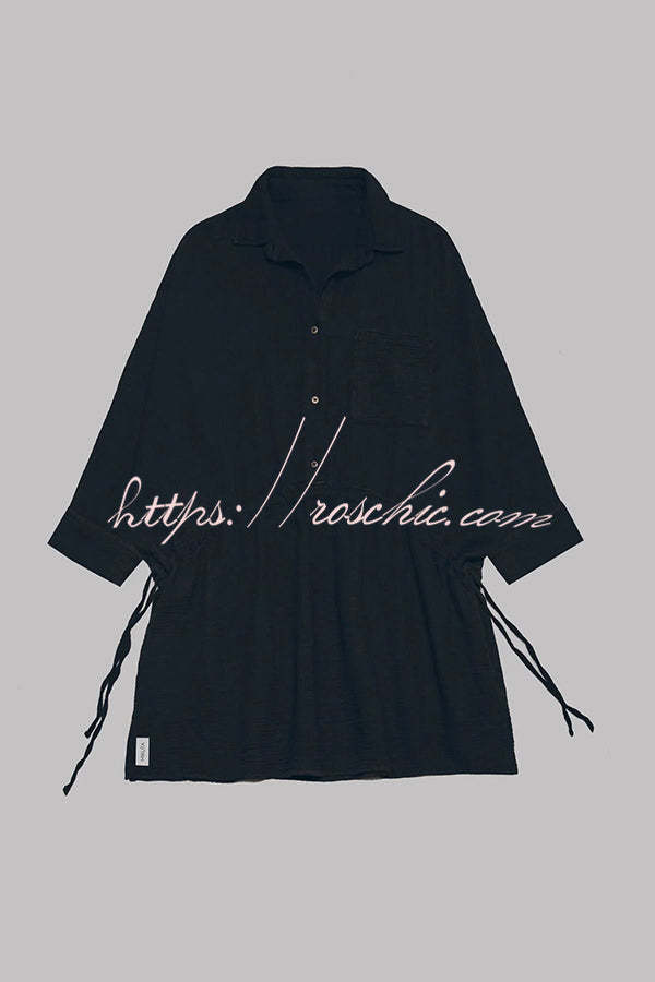 Oversized cotton shirt dress in black with adjustable bands for versatile looks.Our distinctive clothing will add instant style to your wardrobe.