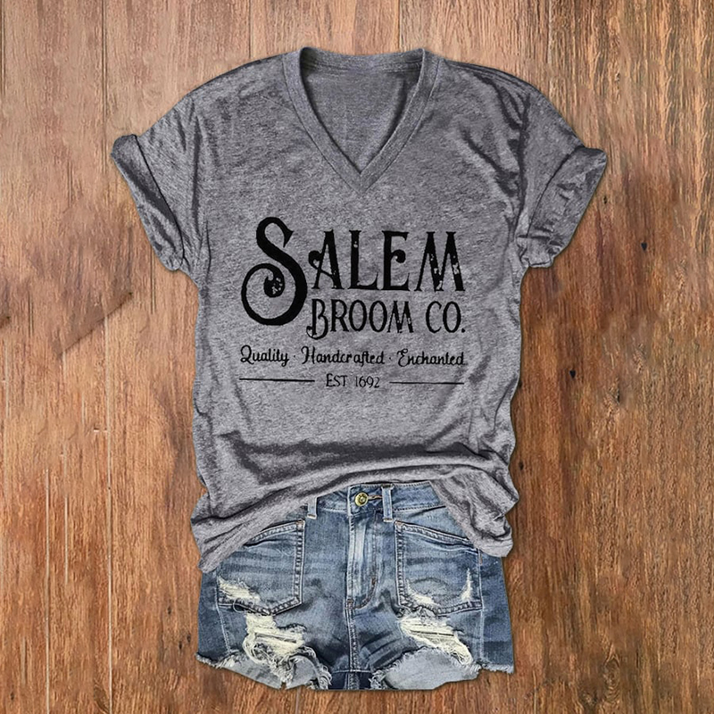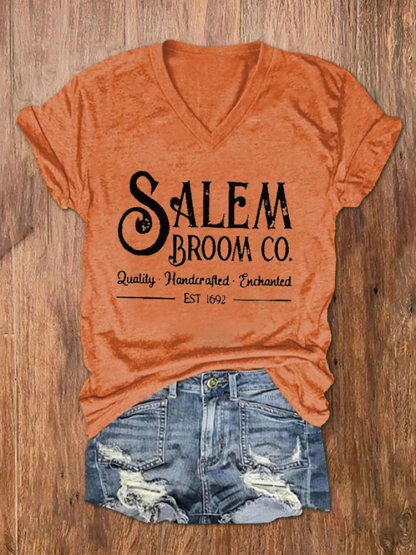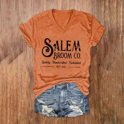 Salem Broom Co Quality Handcrafted Enchanted Est 1692 Print V-Neck T-Shirt