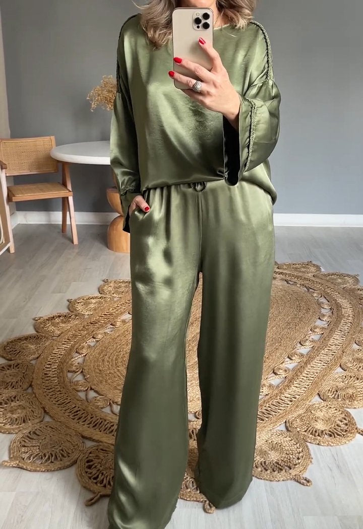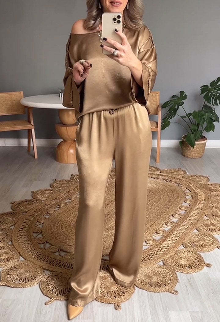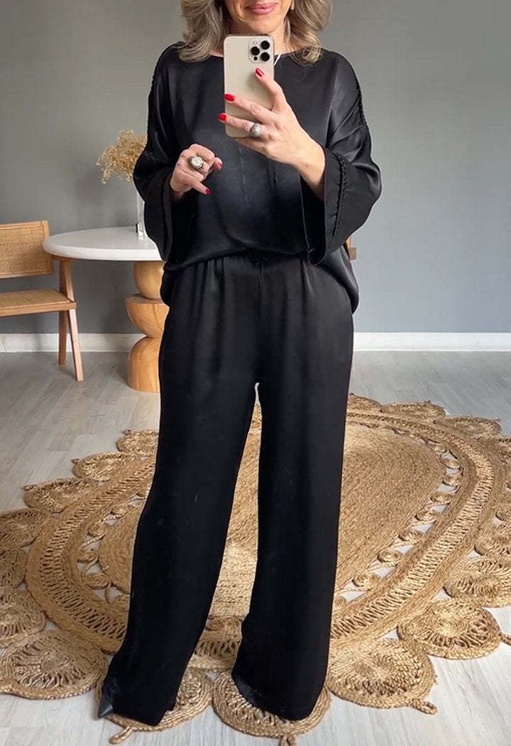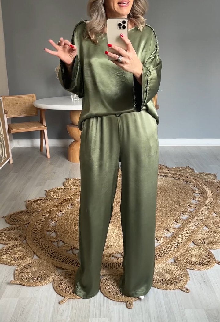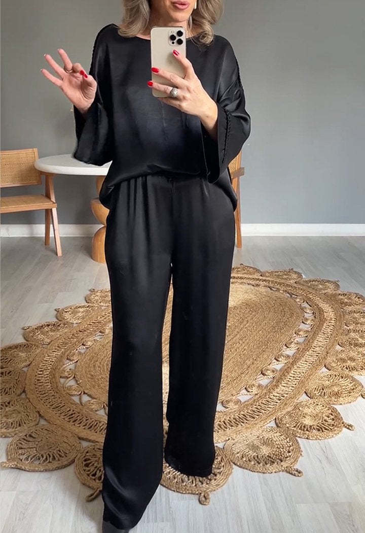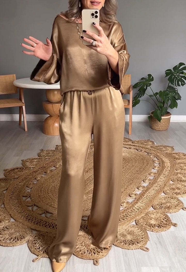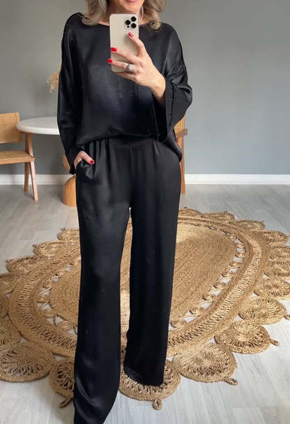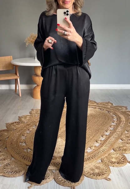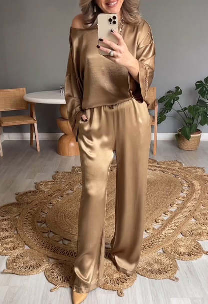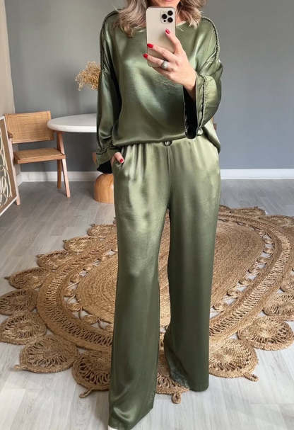 Satin Crew Neck Long Sleeve Two-piece Suit