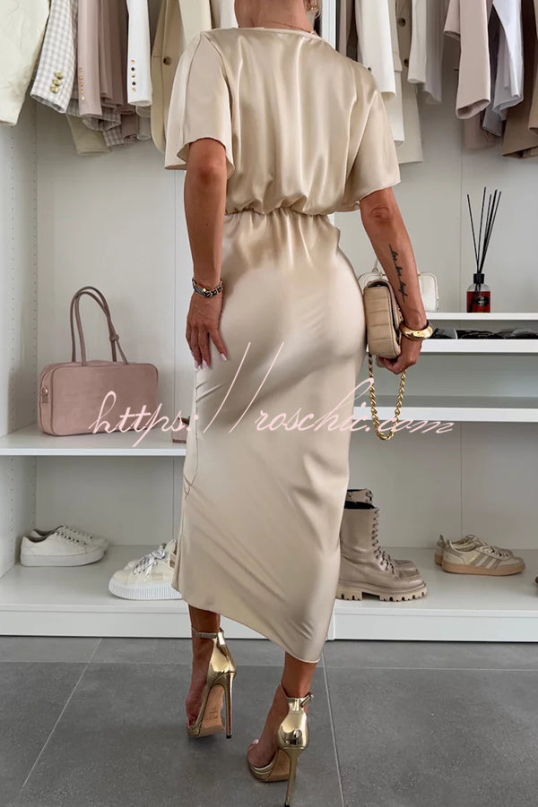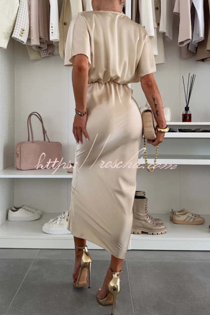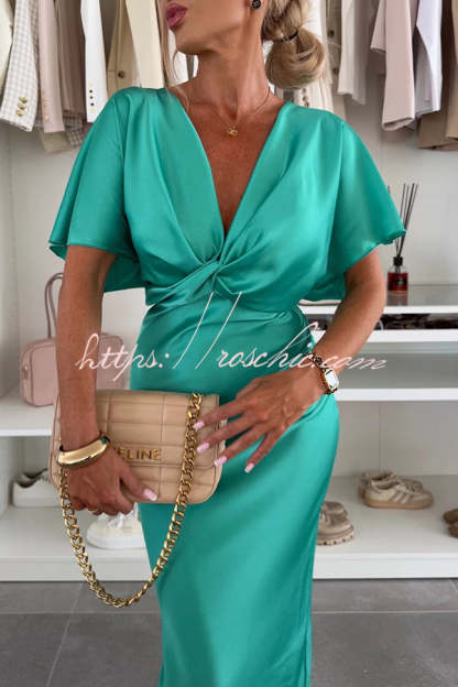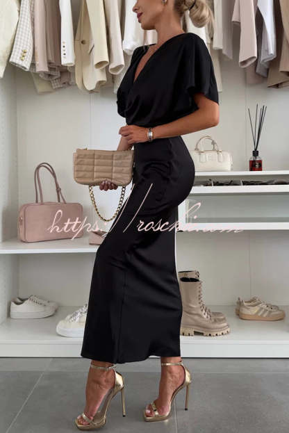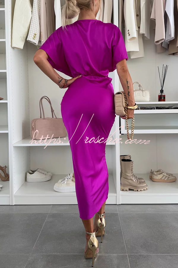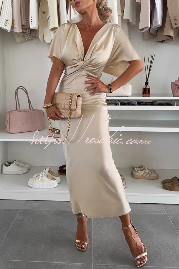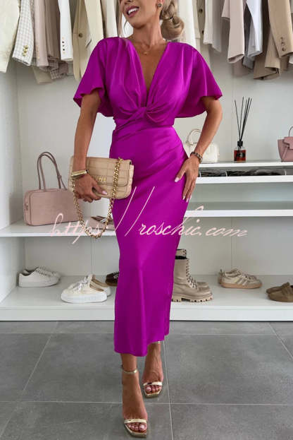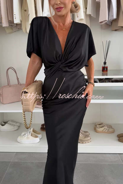 Satin Solid Color V-neck Cross Knot Slim Maxi Dress