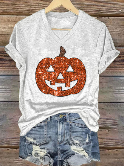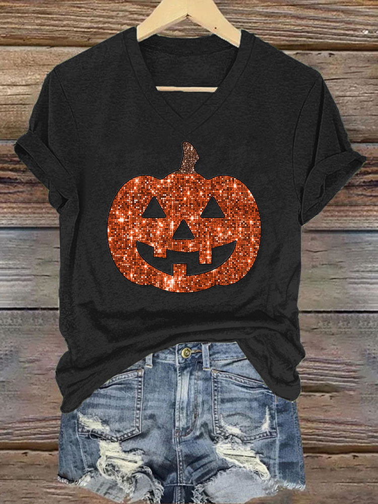 Sequin Halloween Pumpkin Pattern V-Neck T-Shirt