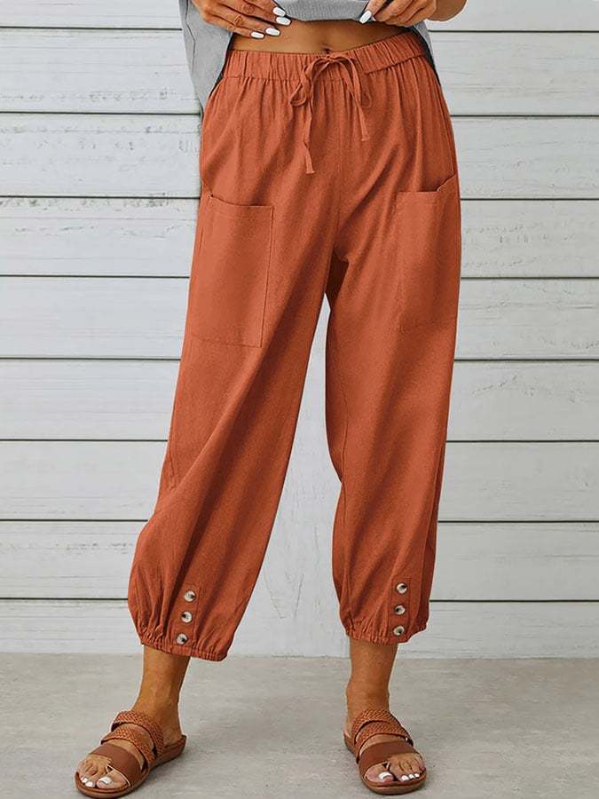 Solid Color Casual With Pocket Buttons Cotton Linen Trousers