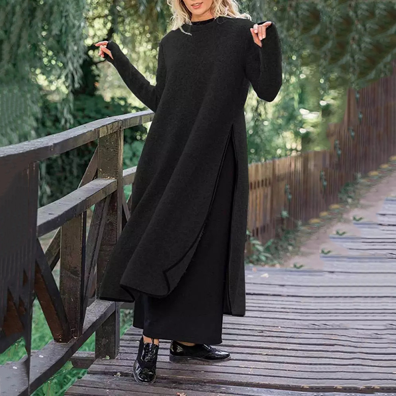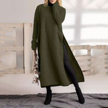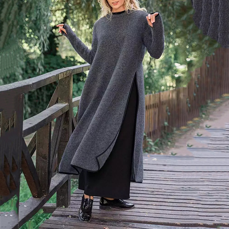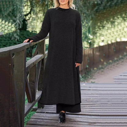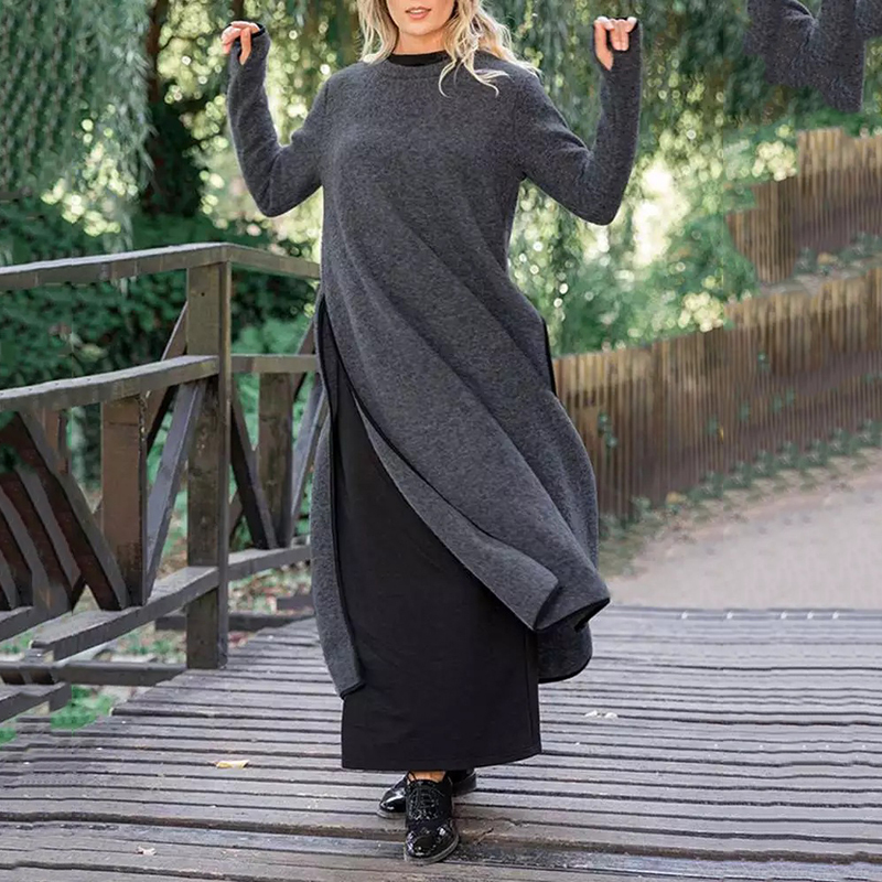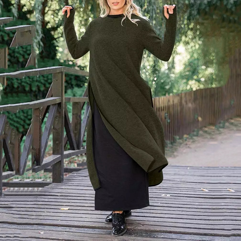 Solid Color Long Sleeve Casual Slit Midi Dress