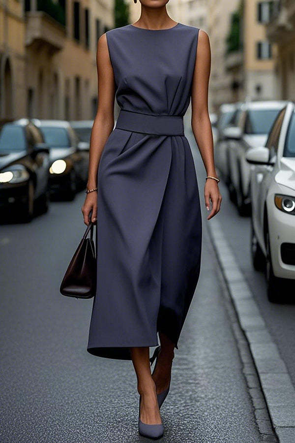 Solid Color Sleeveless Round Neck Casual Midi Dress