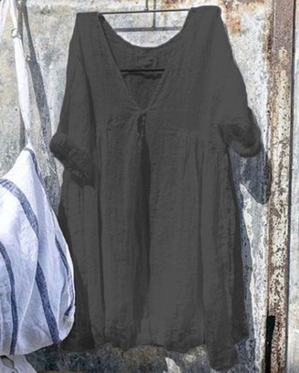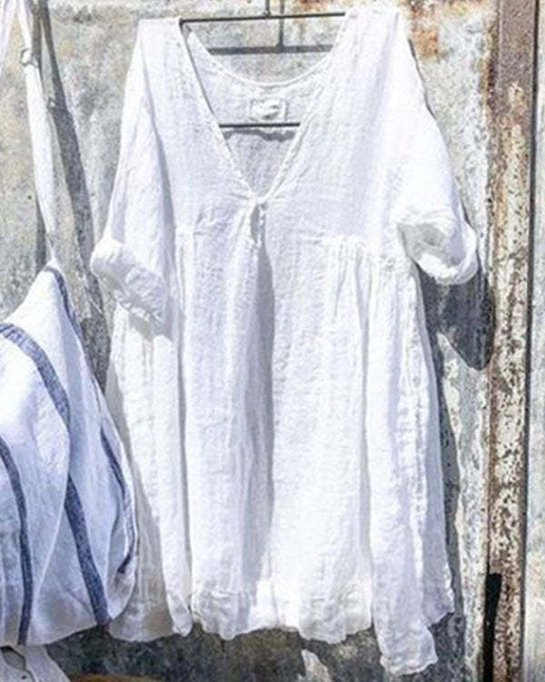 Solid Linen Cotton Loose V Neck Shirt&Top