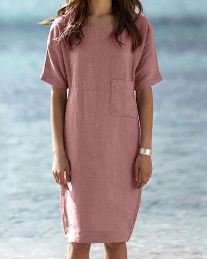 Solid Round Neck Linen Cotton Midi Dress With Pocket