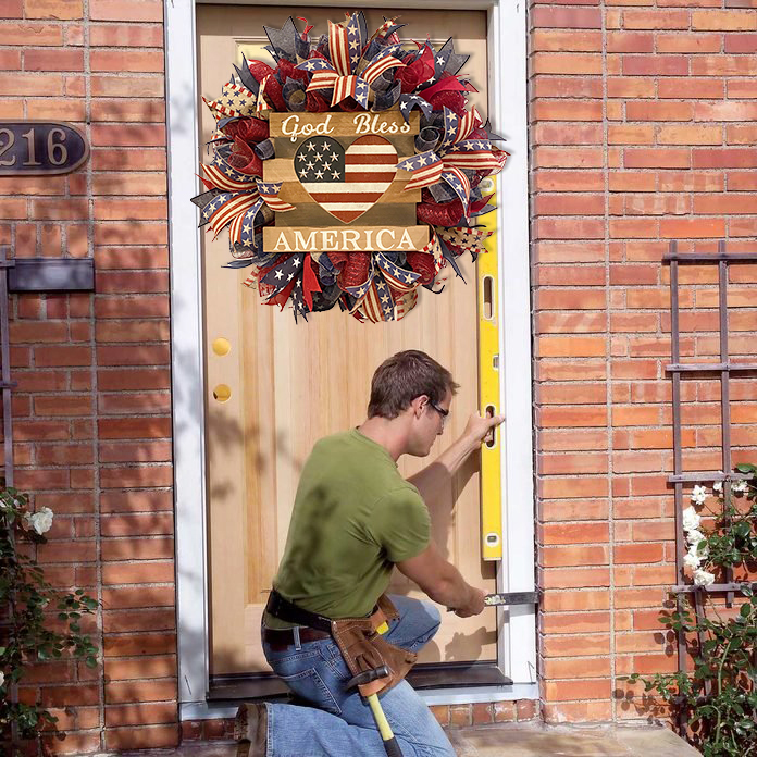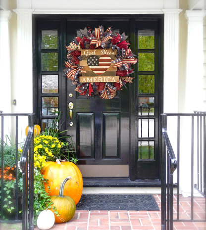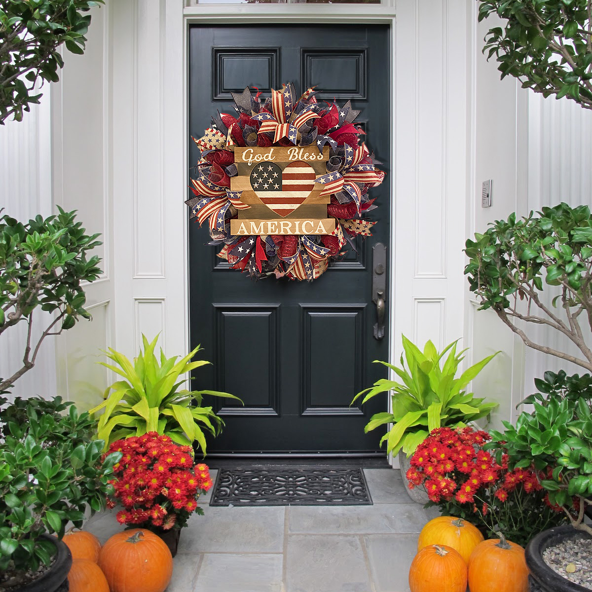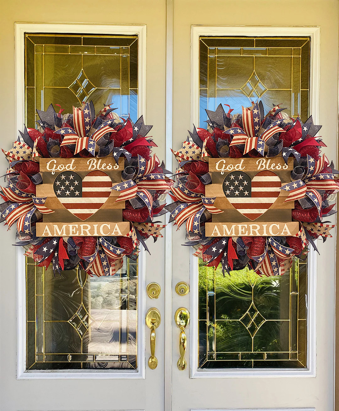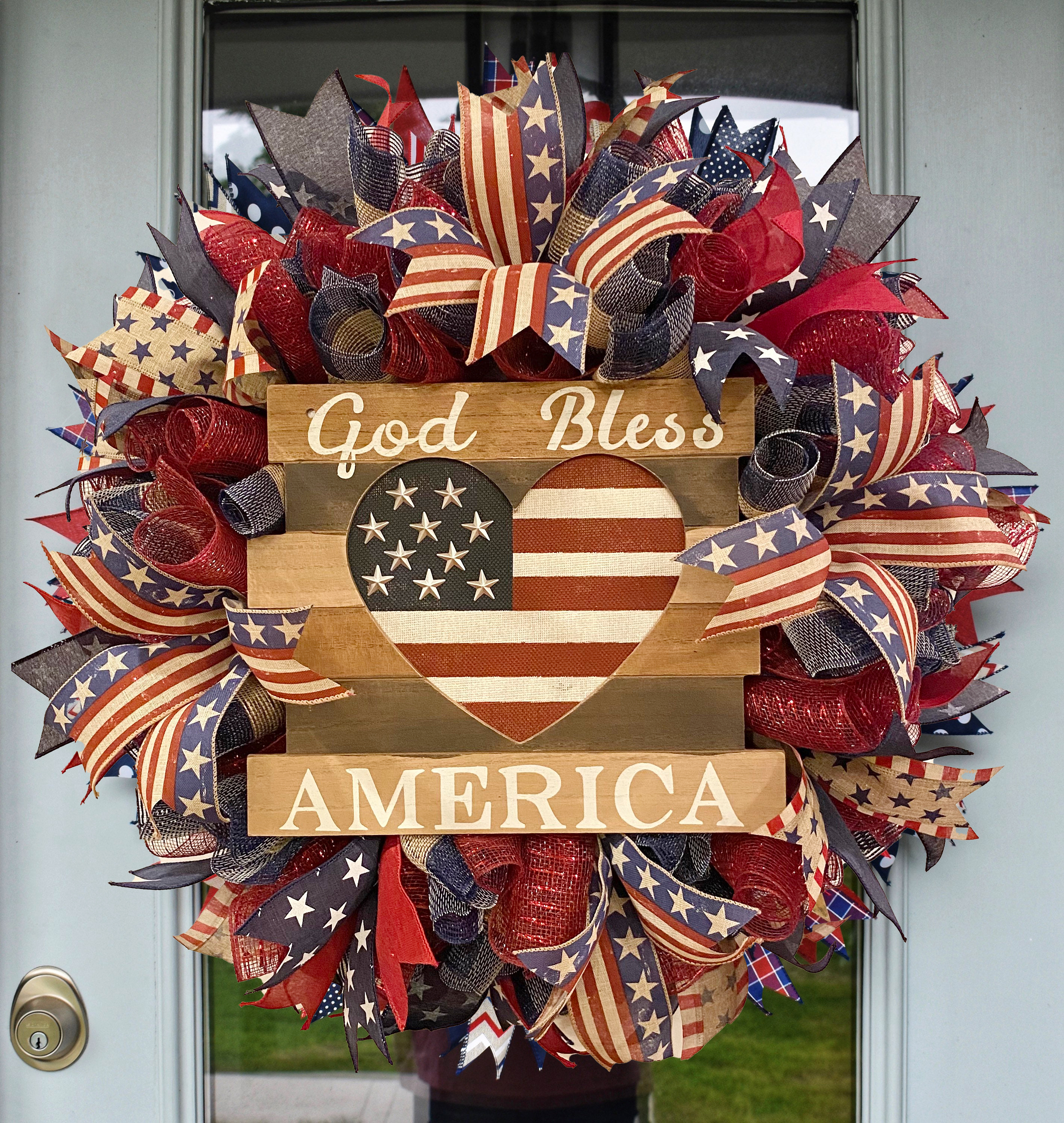 It is made of navy and burlap striped mesh, burgundy metallic deco mesh and coordinating patriotic ribbons. The final touch to this patriotic wreath is the “God Bless America” flag heart wood sign. This wreath can also be displayed from Memorial Day through Labor Day - a perfect Summer wreath!