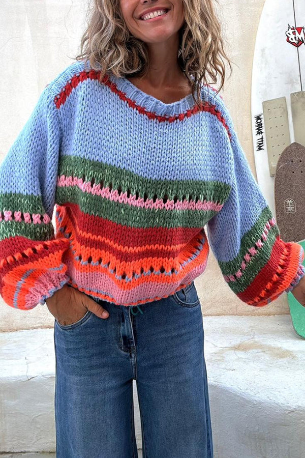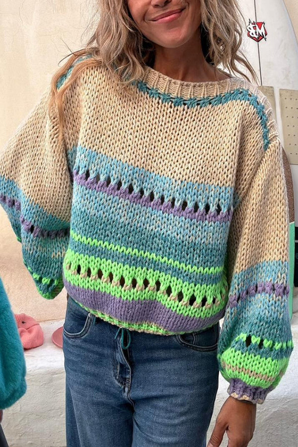 Rainbow Mood Multicolor Round Neck Hollow Long Sleeve Knitted Sweater
