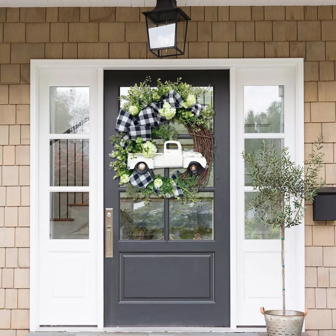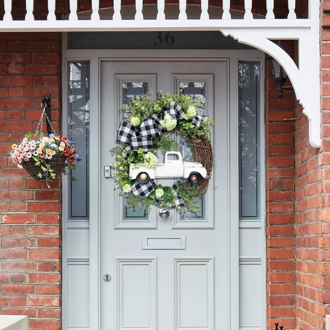 Summer farmhouse truck wreath decoration on the front door. This truck wreath is very hospitable. You will fall in love with it at the front door! Your friends will be surprised by your decoration! Because they have never seen such a wreath! This will open a new chapter in your circle of friends, you will lead a new trend!