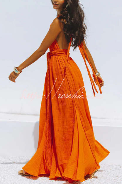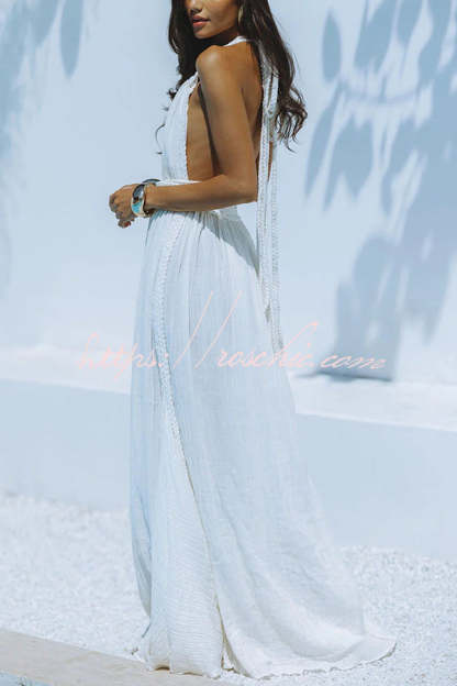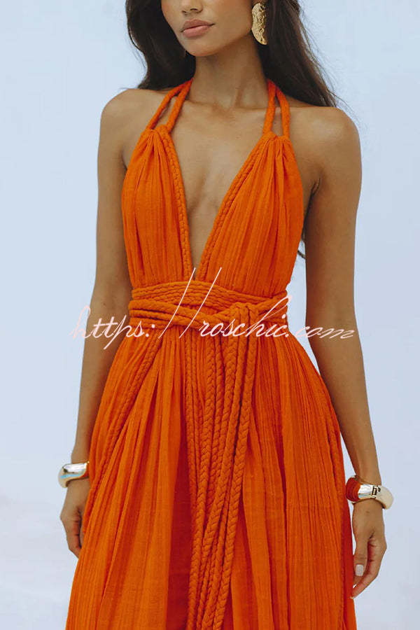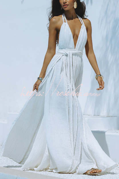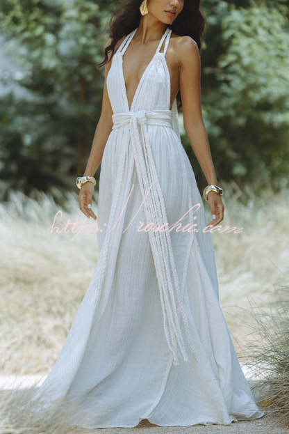 Summer Whispers Linen Blend Draped Braids Deep V-neck Halter Backless Cover Up Maxi Dress
