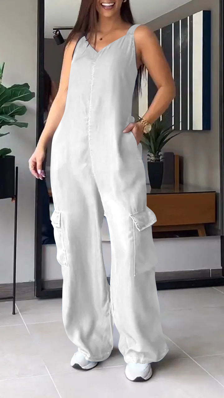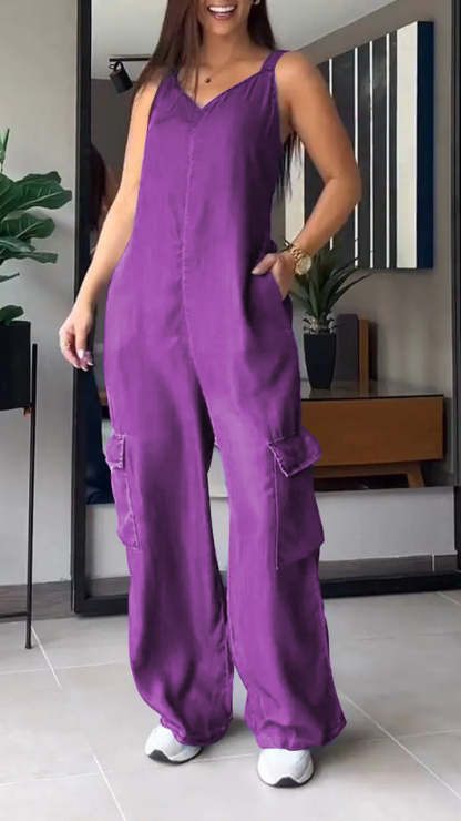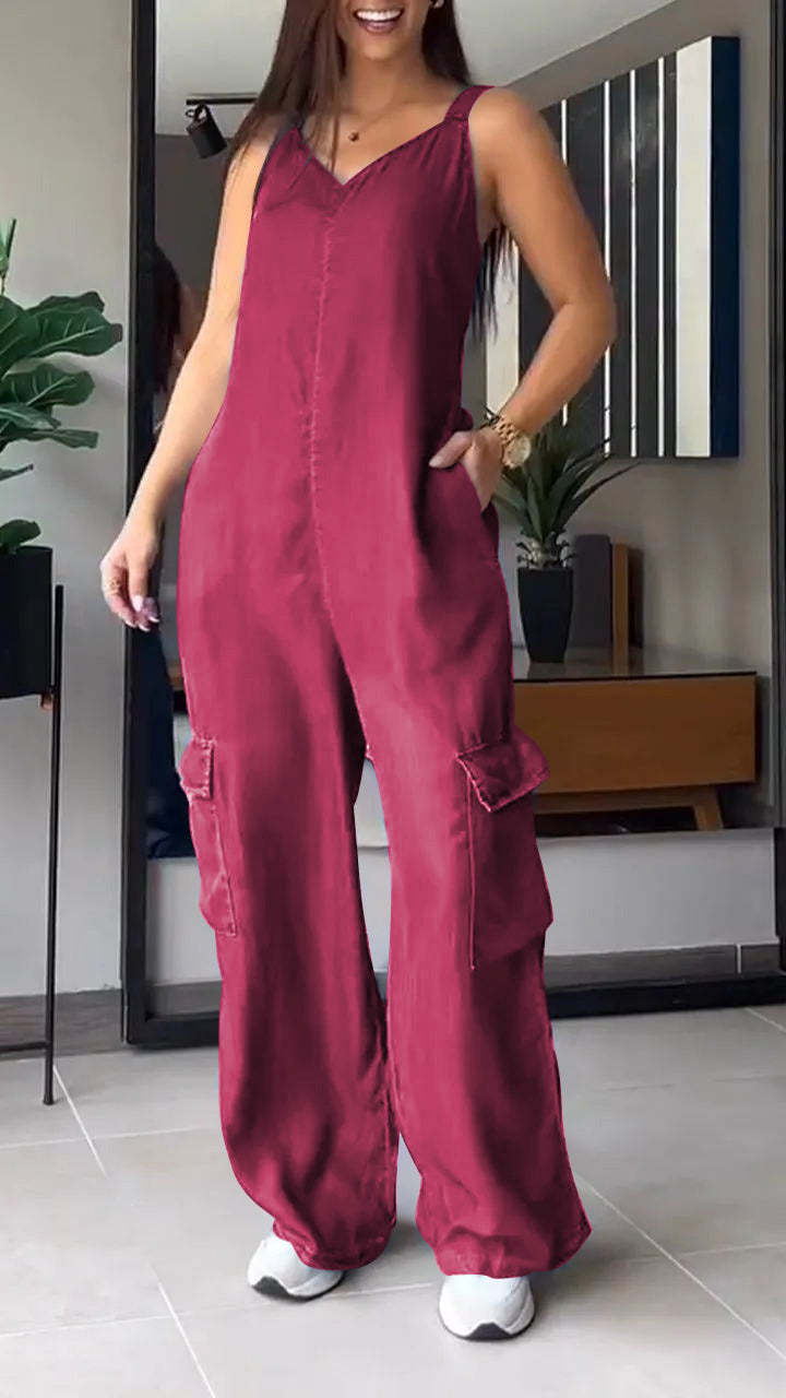 Thin Denim Cargo Pocket V-neck Jumpsuit