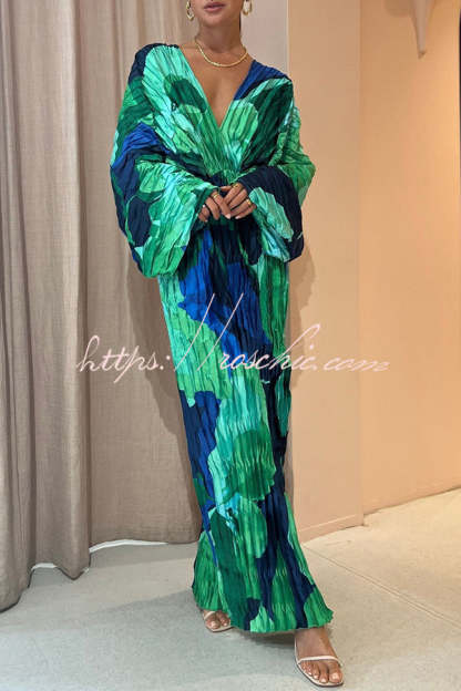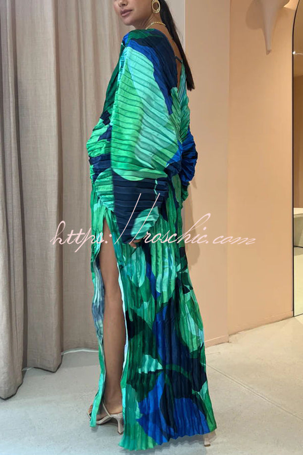 Tropical Oasis Capri Print Kimono Sleeve Pleated Cocoon Maxi Dress
