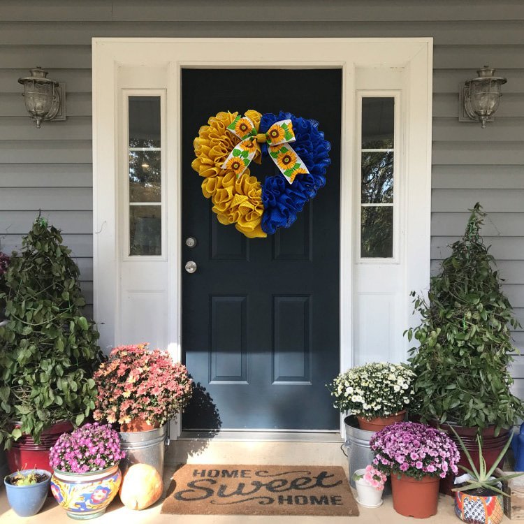 🌞This blue and yellow Loveheart flower wreath done in the colors of the Ukrainian flag can be hung on your front door to show your solidarity with Ukraine.