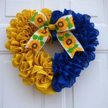 This beautiful heart shaped burlap wreath is handmade with yellow and blue burlap ribbons to represent Ukrainian flag, yellow stands for wheat fields and blue stands for the blue sky. This wreath is accented with a bow made out of the ribbon with sunflowers on it. Sunflower is a national flower of Ukraine.