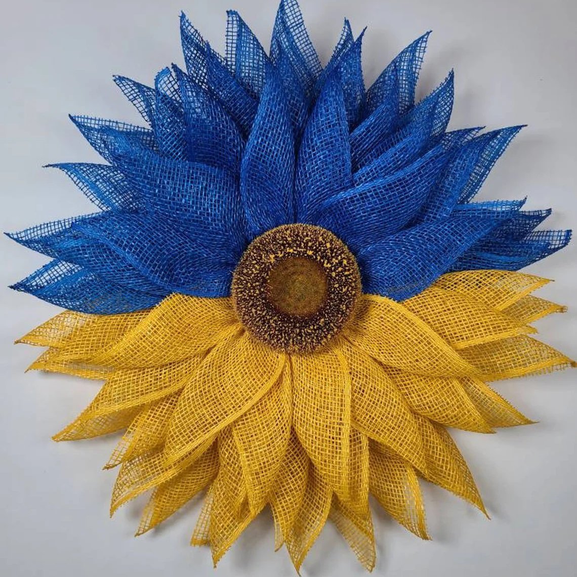 The flower features royal blue petals on the top and yellow petals on the bottom, representing the flag of Ukraine. The styrofoam center resembles the center of a sunflower, the National flower of Ukraine. This wreath measures about 18" in diameter and about 4" in depth.