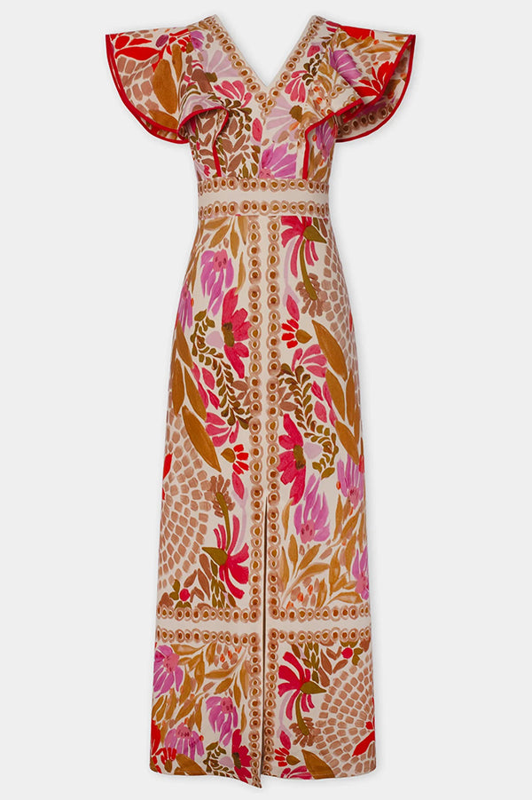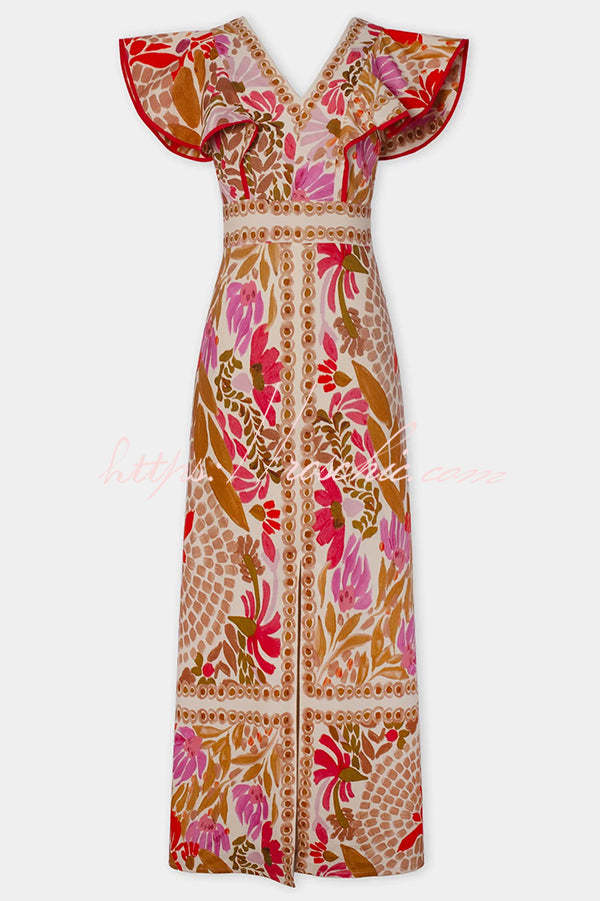 Unique Printed V-neck Open Back Ruffled Sleeves Slit Maxi Dress