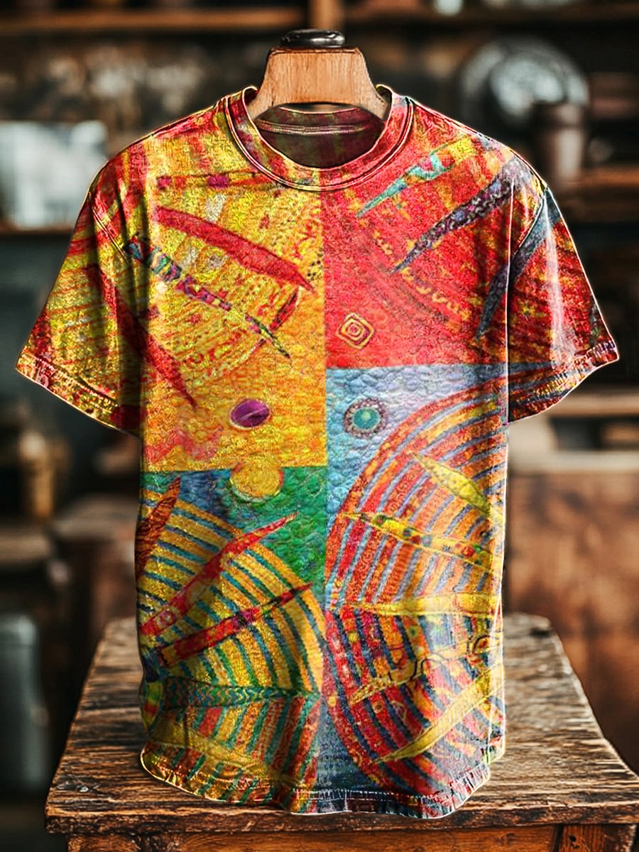 Unisex Bohemian Sun Collage Art Pattern Print Casual Loose Short Sleeve T-Shirt