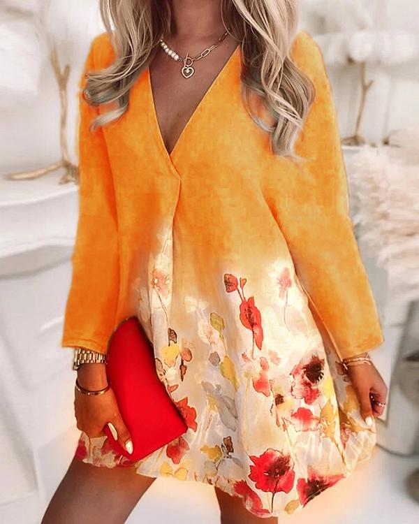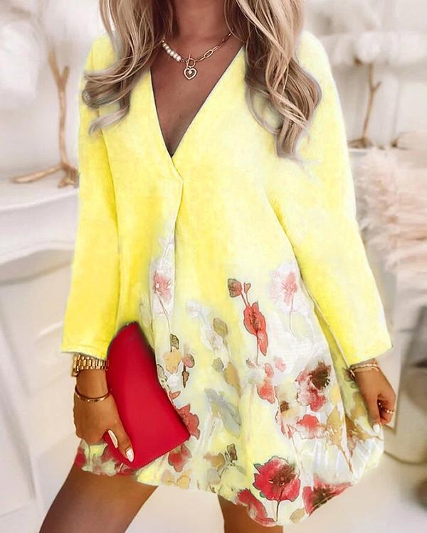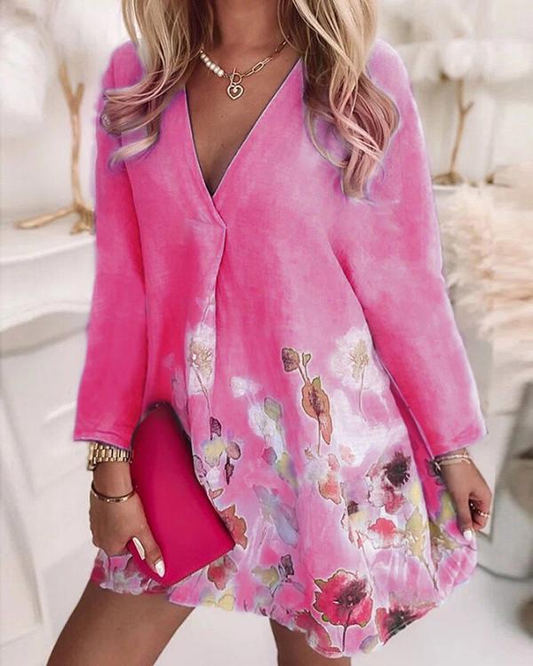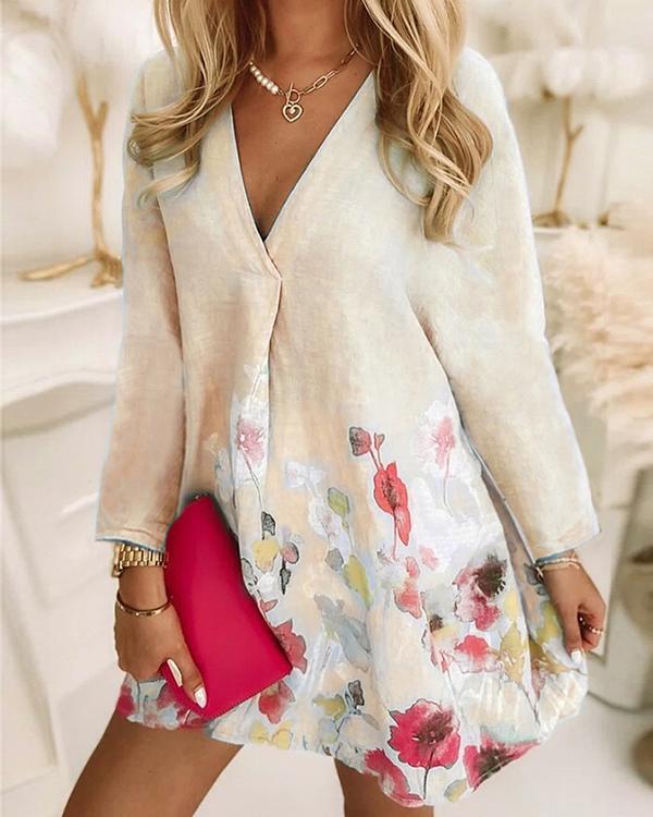 V-neck Loose Printed Linen Long-sleeved Dress