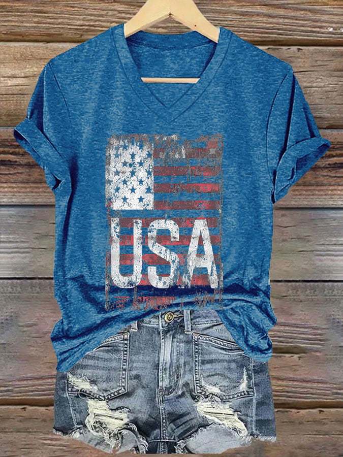 🔥Last Day 49% Off🔥V-Neck Retro Independence Day Flag USA Print T-Shirt