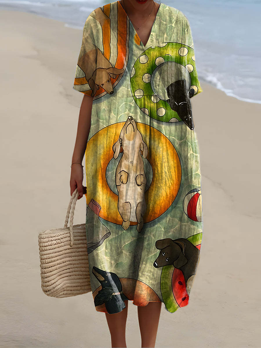 Vintage Animal Art Print V-Neck Elegant Chic Loose Short Sleeve Midi Dress